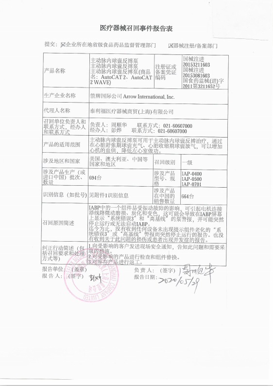 产品存故障隐患,3款医疗器械面临“一级召回”!国家药监局日前发布《箭牌国际公司Arrow International, Inc.对主动脉内球囊反搏泵(商品名:AutoCAT 2、AutoCAT 2 WAVE)主动召回》通知称:泰利福医疗器械商贸(上海)有限公司报告,由于涉及产品可能存在IABP中一个组件易受振动故障的影响,最终引起突然停止运行或无法启动IABP的问题,生产商箭牌国际公司Arrow International, Inc.对主动脉内球囊反搏泵(商品名:AutoCAT 2、AutoCAT 2 WAVE)(注册证编号:国械注进20153211603、国械注进20153081603、国食药监械(进)字2011第3211652号)主动召回,召回级别为一级。