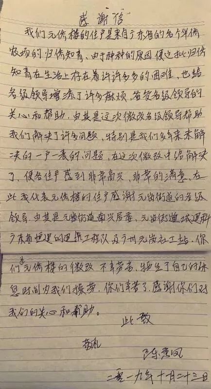 居民对此感激不已,还特地给南兴社区写了感谢信,“这次微改造各级领导帮助我们解决了许多问题,特别是我们多年来未解决的一户一表的问题……感谢你们的关心和帮助!”