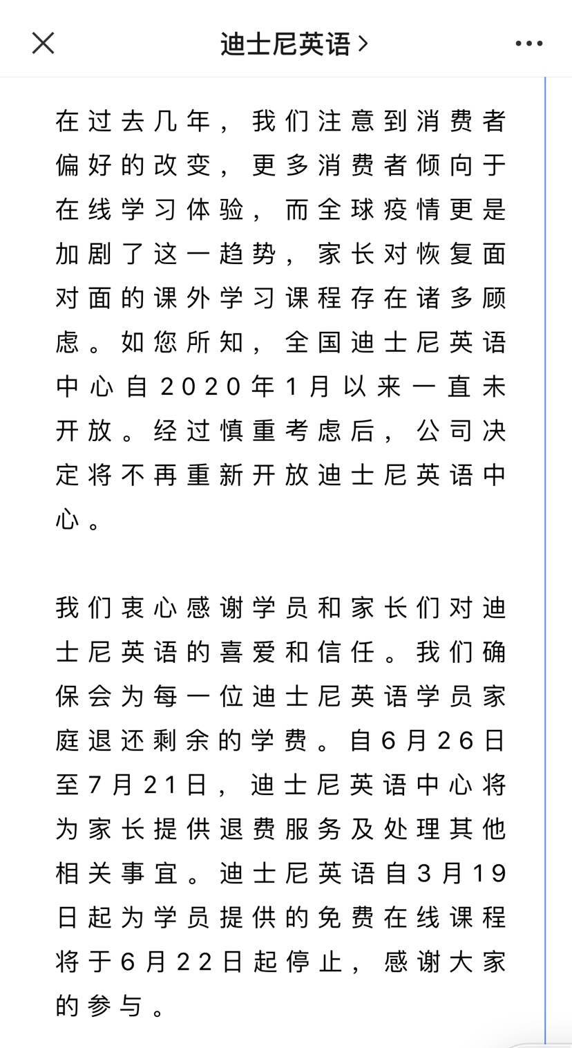 今日(6月22日)中午,迪士尼英语在其微信公众号发布《致迪士尼英语学员及家长的一封信》,宣布公司将不再重新开放迪士尼英语中心,并确保为每一位学员家庭退还剩余的学费。自6月26日至7月21日,迪士尼英语中心将为家长提供退费服务及处理其他相关事宜。迪士尼英语自3月19日起为学员提供的免费在线课程将于6月22日起停止。