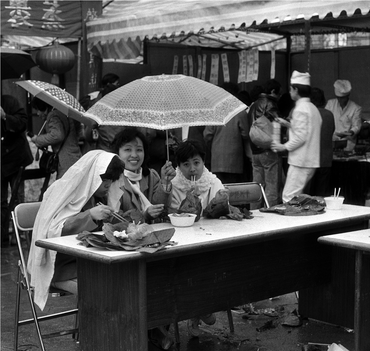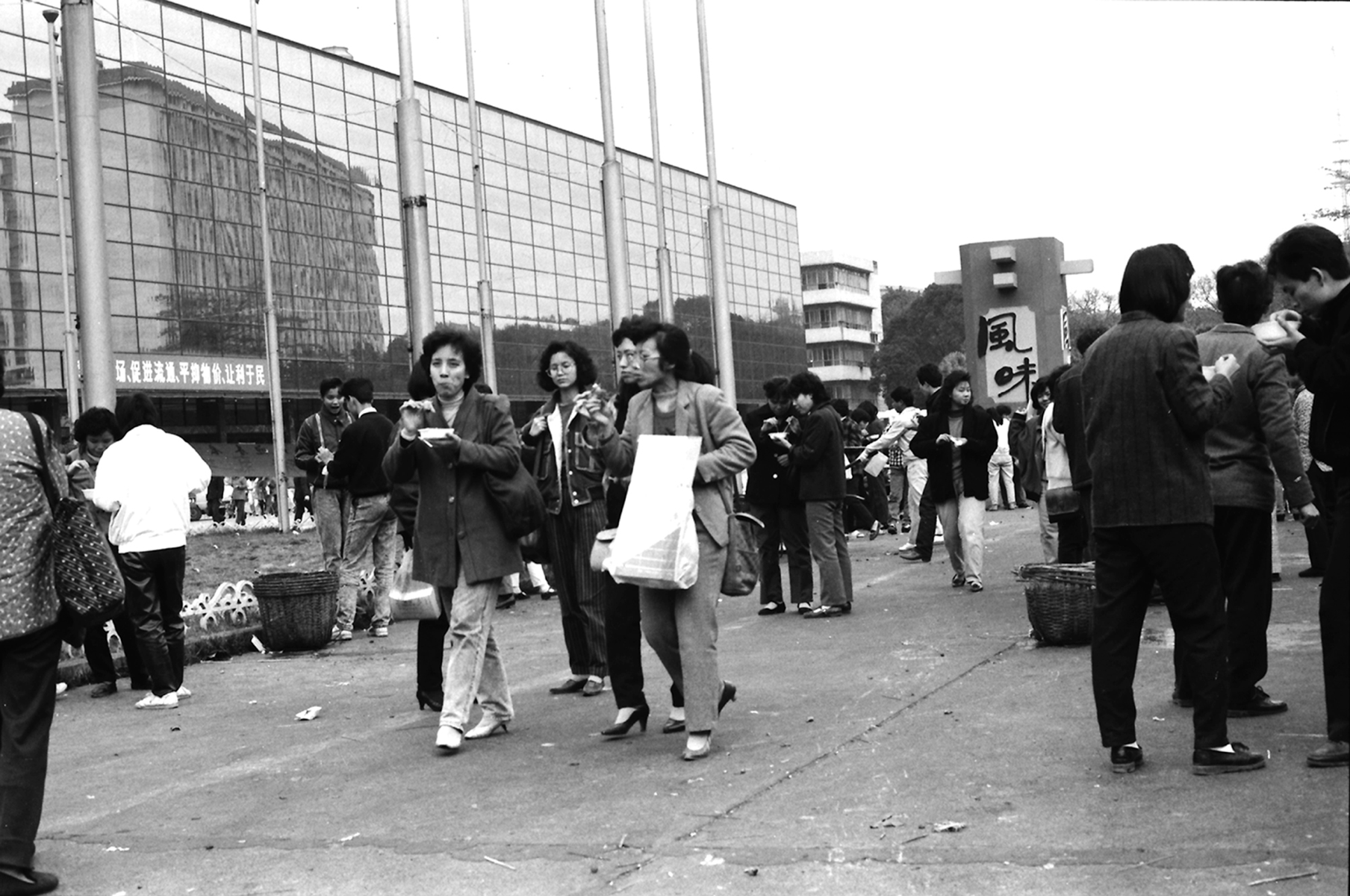 1989年摄 在旧广交会广场举办迎春食街,食客雨中吃裹蒸粽