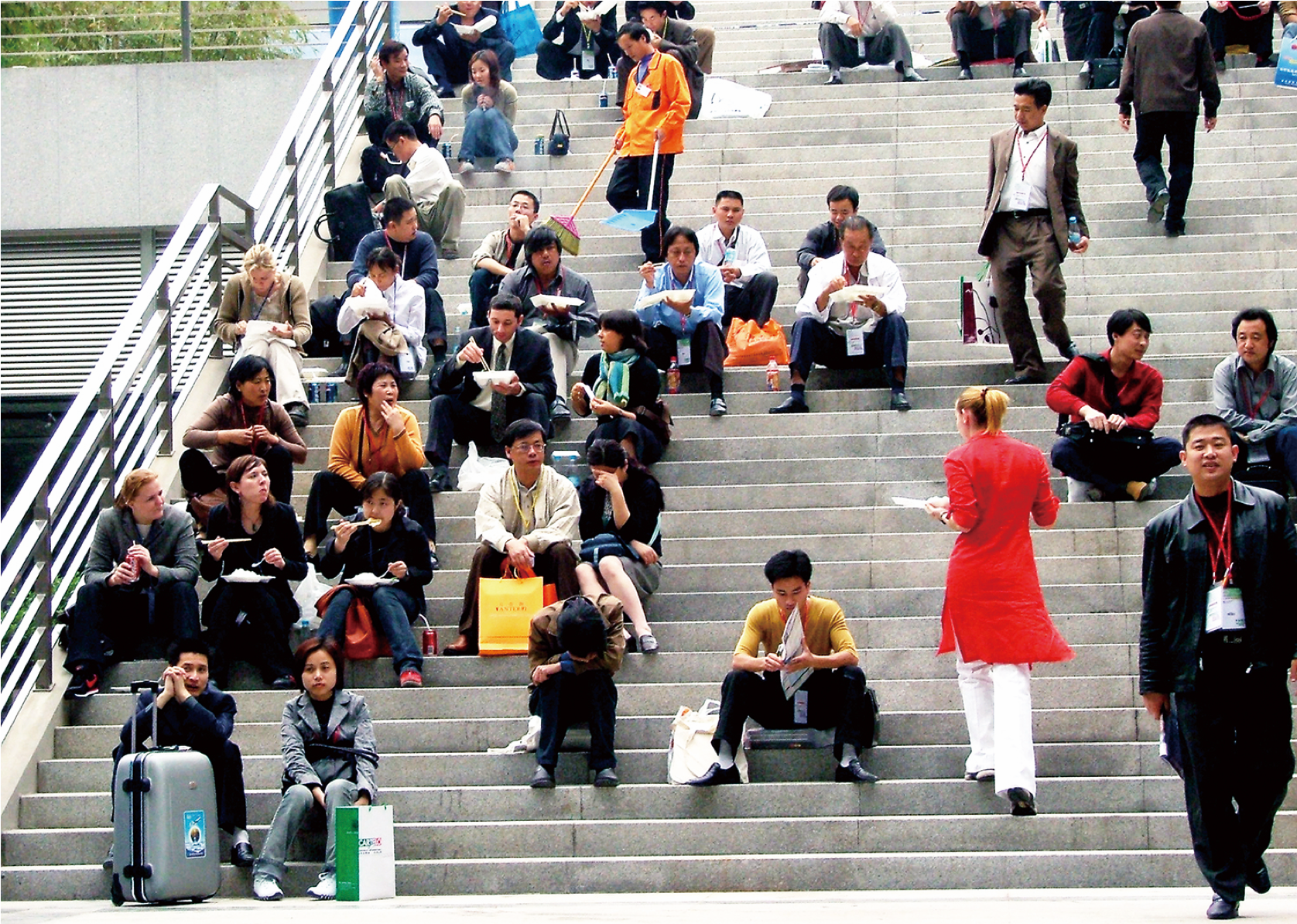 2008年摄 乘客被安排在旧广交会场馆并在引导牌下候车