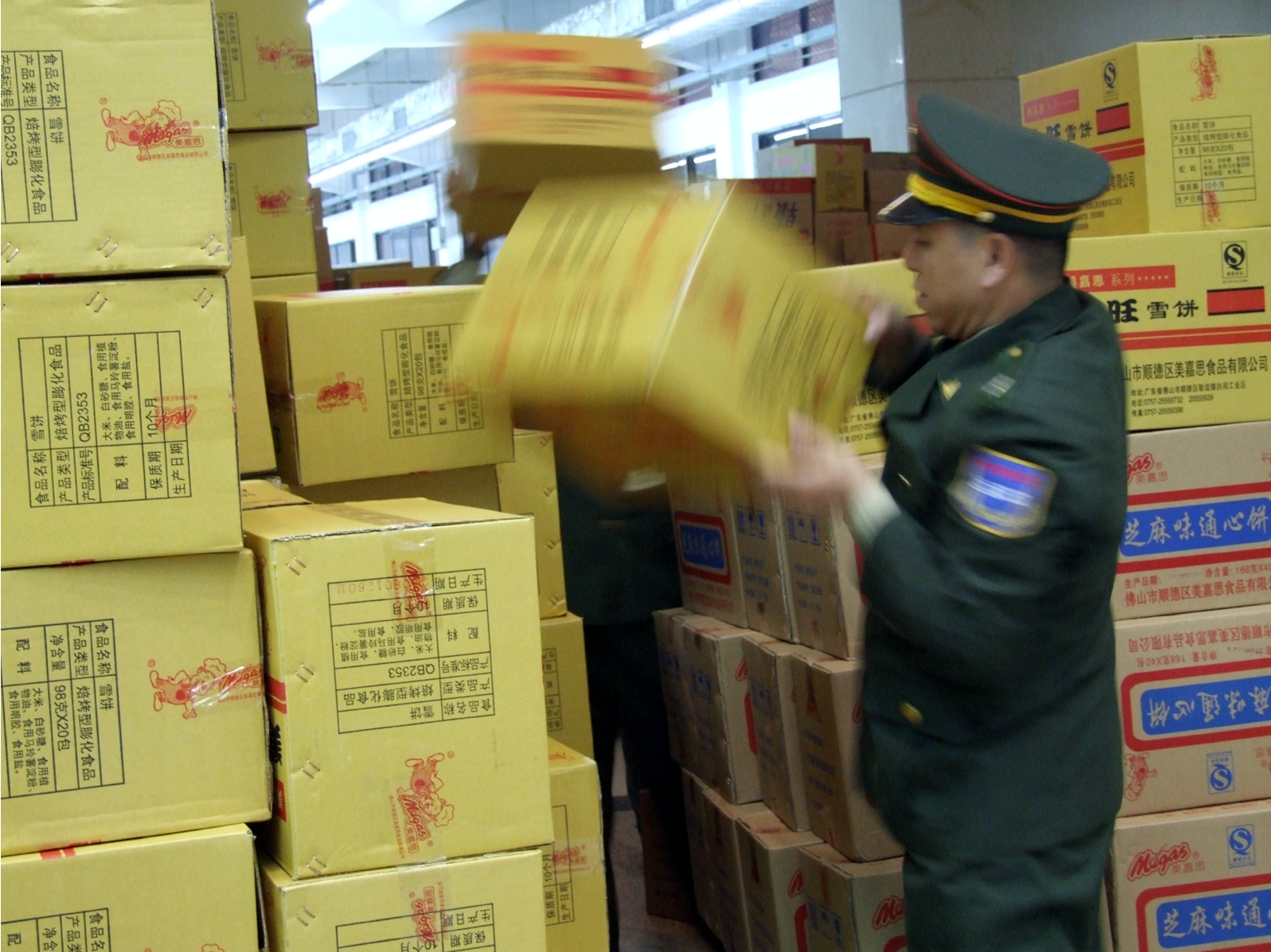 2008年摄 运政人员不断把饼干运进旧广交会场馆准备免费派发