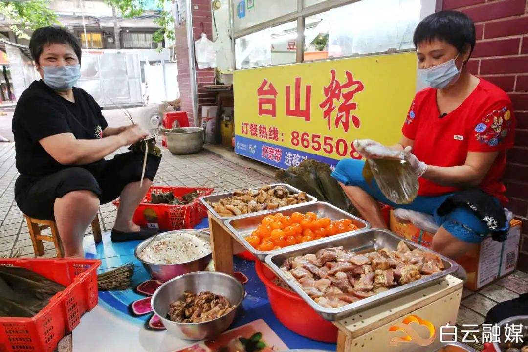 她的店铺“藏”在居民楼下,从早餐到晚饭都有供应,全手工的台山粽子和各种糕点是他们的招牌。