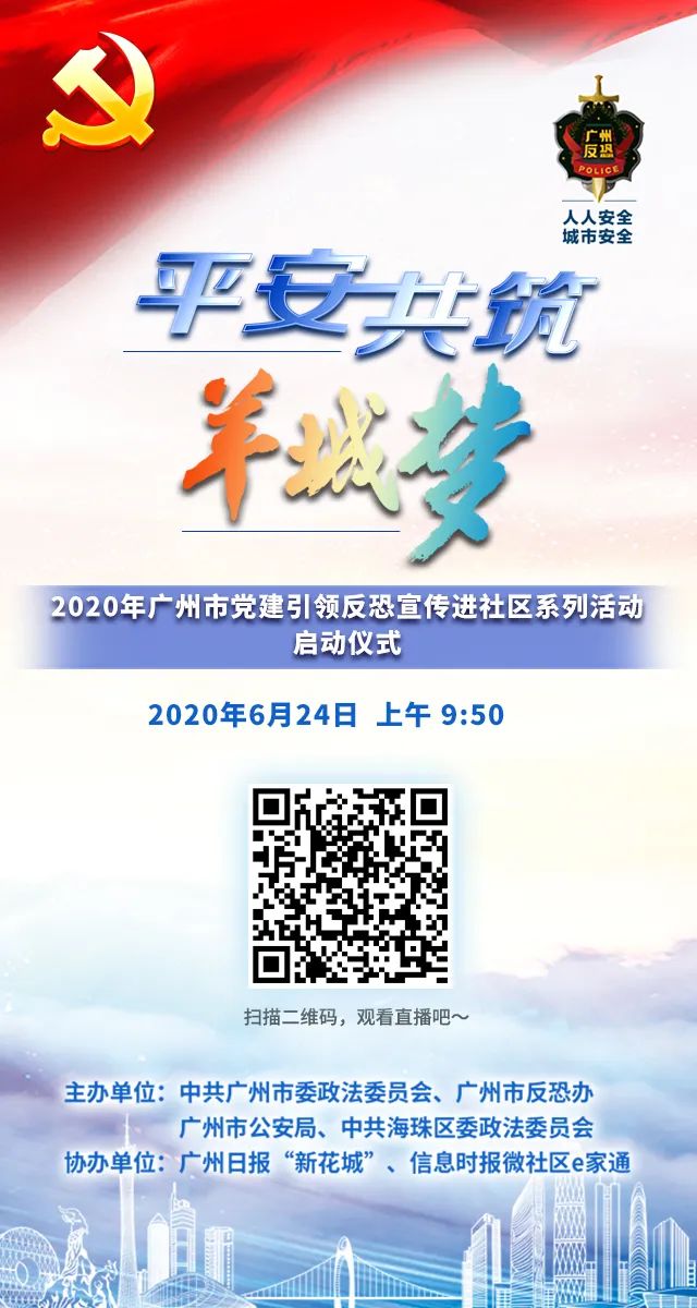 6月24日上午9:50,平安共筑羊城梦——2020年广州市党建引领反恐宣传进社区系列活动启动仪式,将在海珠区新时代文明实践中心(海珠智汇科技园)举行。