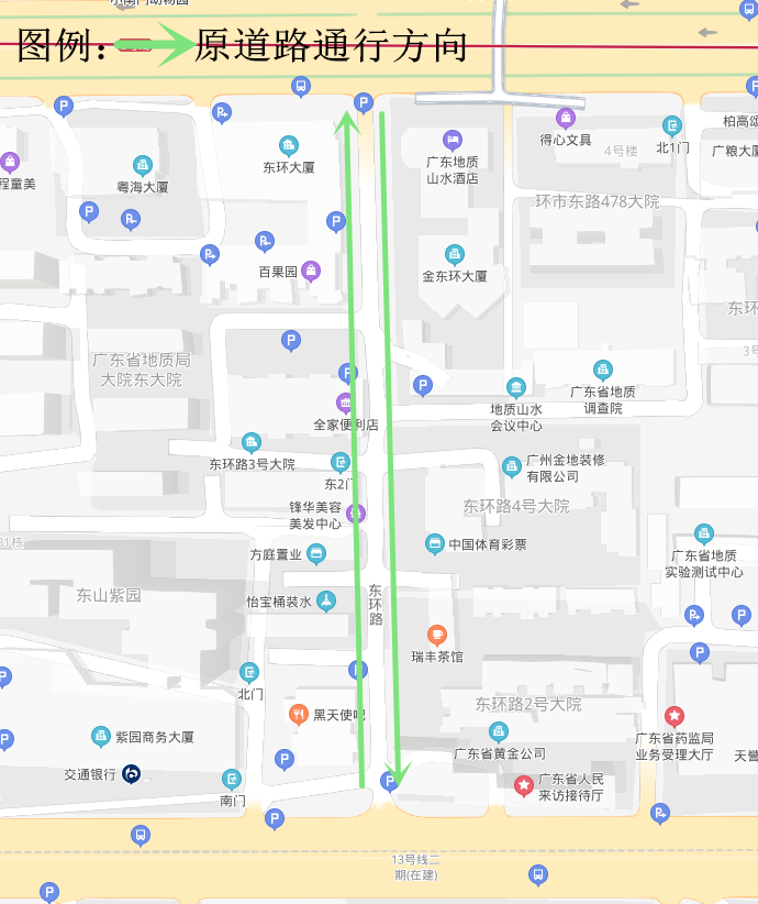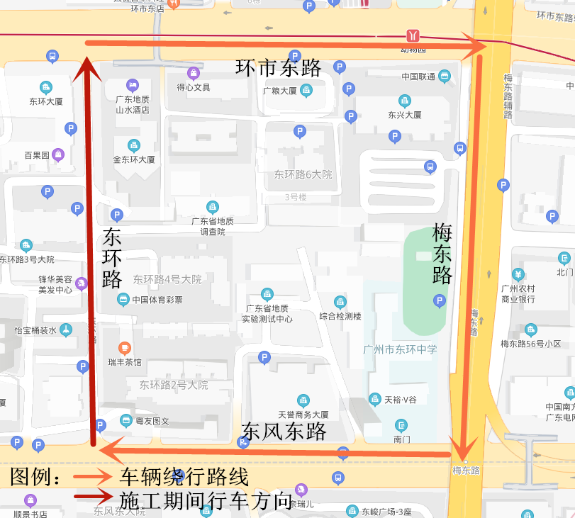 因需占用东环路部分行车道进行施工,施工期间东环路将调整为南往北单向行驶,过往车辆请通过环市东路、梅东路、东风东路等周边道路绕行,绕行线路如下图所示。请过往车辆按标志标线指示行驶,听从现场交通疏导人员指挥,施工期间造成的不便之处,敬请谅解。