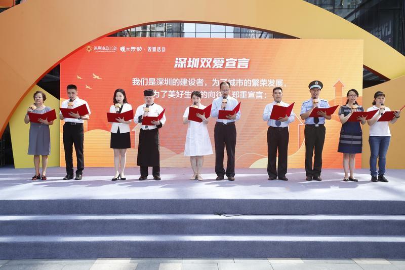 活动现场,来自罗湖辖区的深圳市水贝万山珠宝产业发展有限公司、深圳阳光酒店、深圳市星银医药有限公司、深圳市华佳宏物业投资集团有限公司、铭基食品有限公司的企业和职工双方代表,带领全场职工观众代表共同发布“双爱宣言”,并共同签署“八有八要”承诺书,活动现场还为企业、职工代表颁发了“双爱活动”纪念牌。活动最后,相关出席领导共同点亮了象征着企业、职工互助互爱的“双爱之星”,标志着“同舟共济战疫情 互利共赢促发展”2020深圳市“企业爱员工 员工爱企业”双爱活动正式启动。