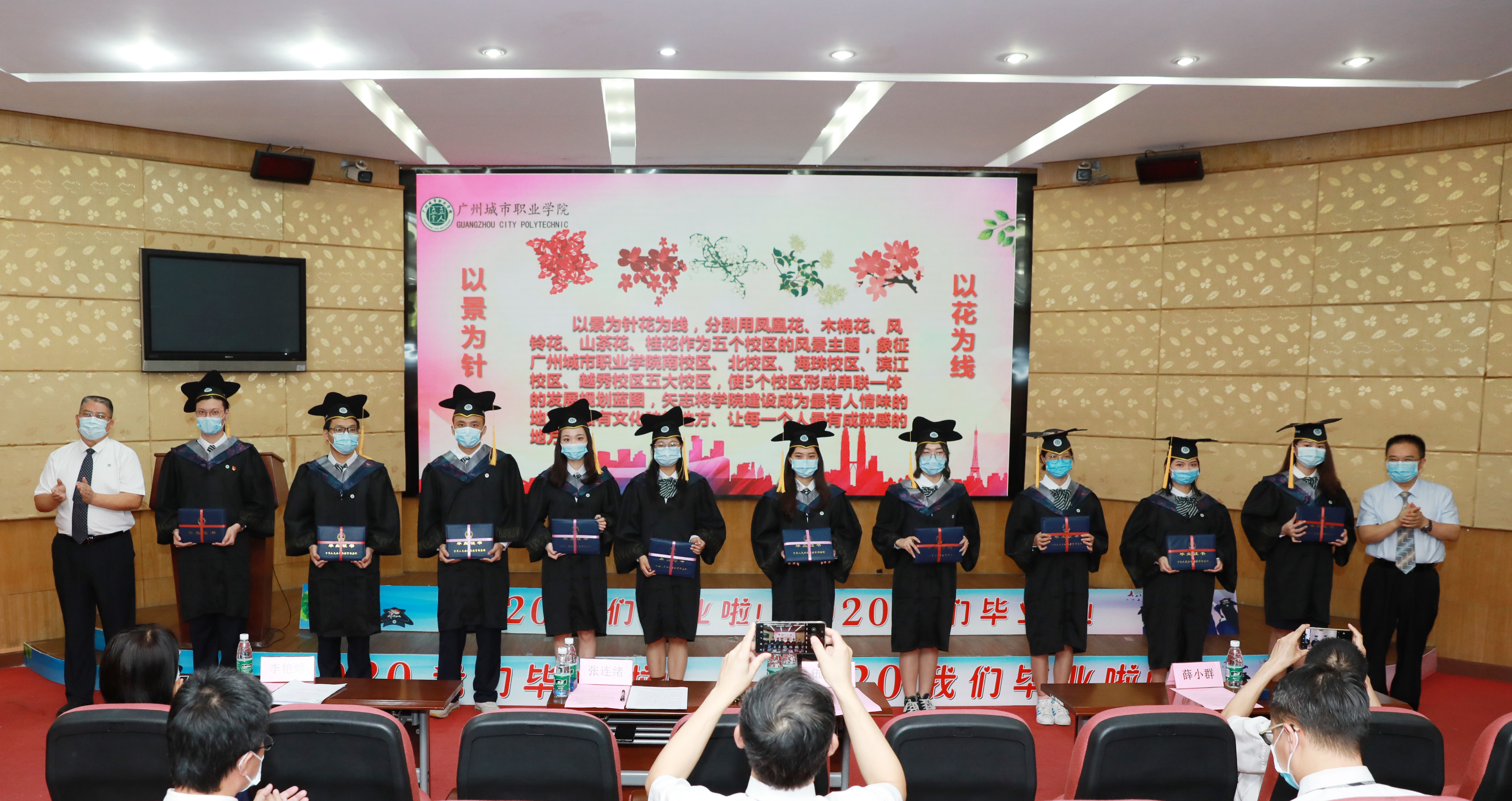 6月23日,广州城市职业学院(以下简称广州城职院)2020届毕业生“云”上毕业典礼,在广园南校区8号楼学术报告厅举行。学院部分教职工、毕业生代表,以及在屏幕前近万名毕业生、在校生和校友,“云”聚一堂,共同见证这一庄严而又激动人心的时刻。