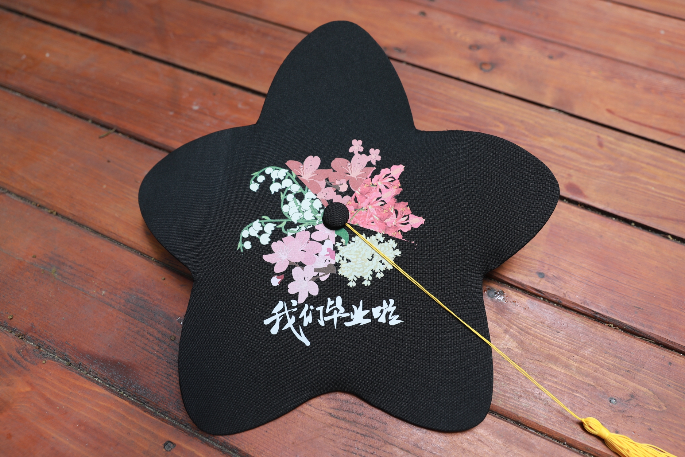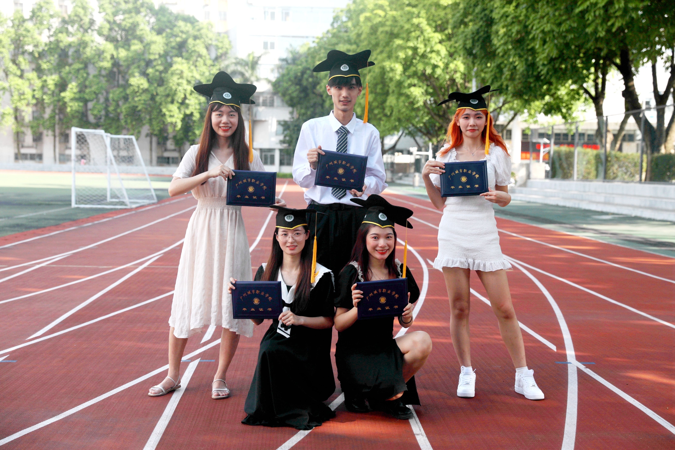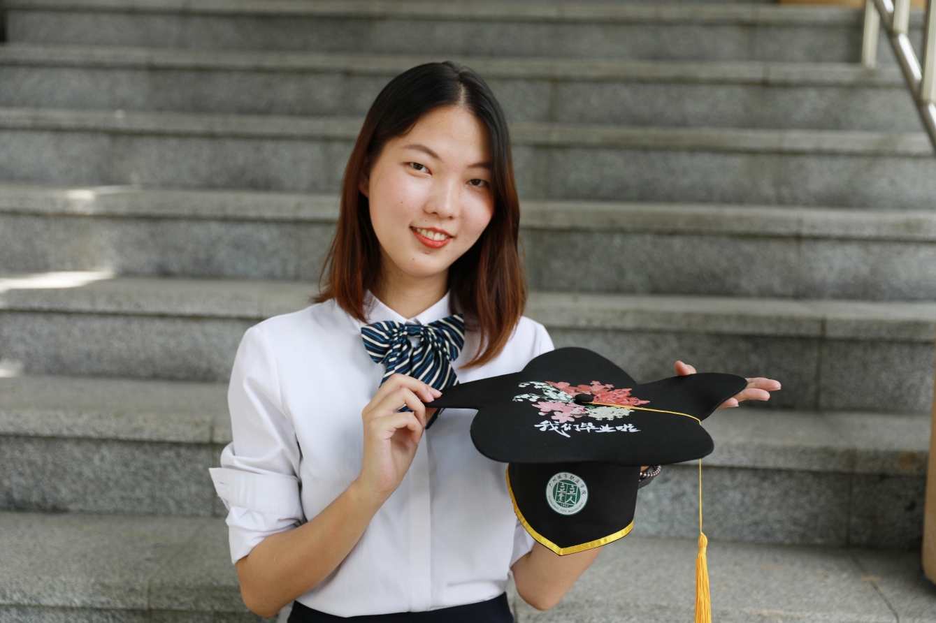 毕业帽的外形灵感来源于木棉花,木棉花作为广州的市花,是英雄之花,毕业帽形似木棉,五片花瓣,代表了广州这座城市。同时,木棉花象征着蓬勃向上的事业和生机,广州城市职业学院希望莘莘学子在离开校园之后,奔向更美好的未来。毕业帽以景为针、以花为线,分别用凤凰花、木棉花、风铃花、山茶花、桂花作为五个校区的风景主题,象征了学院五大校区。