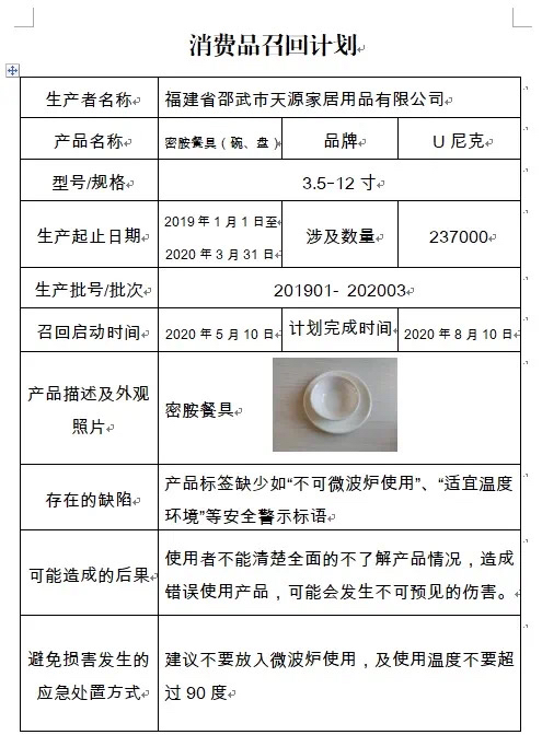 据悉,本次召回范围内的密胺餐具(碗、盘),由于产品标签缺少如“不可微波炉使用”、“适宜使用温度环境”等相关安全警示标语,使用者在不能清楚全面的了解产品的情况下,造成错误使用产品,可能会发生不可预见的伤害,存在一定的安全隐患。对于召回范围内的密胺餐具(碗、盘),福建省邵武市天源家居用品有限公司将积极落实企业主体责任,开展缺陷产品召回、安全技术改进工作,提升产品安全水平,并免费为消费者补贴带警示标语的新标签,以消除安全隐患。