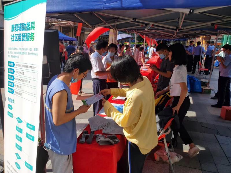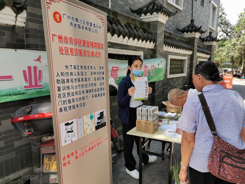 “我们有价格实惠的康复辅助器具给大家共享使用啦,普通轮椅每月租金72元、助行器每月租金30元、坐式踩踏器每月租金25元……”在广州市南沙区南沙街、东涌镇的社区宣传摊位前,工作人员正在热情向社区群众介绍康复辅助器具的租赁方式和租金情况,还邀请有需要的街坊到租赁服务厅进一步了解产品、体验辅具,详细介绍辅具产品的作用。