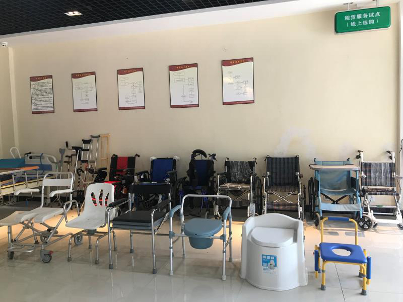 在2个试点辅具展示区,整齐配备和展示了多种类型的轮椅、拐杖、肢体康复器、助行器、餐具等,基本上可以满足社区群众的社区康复、居家康复的需求。