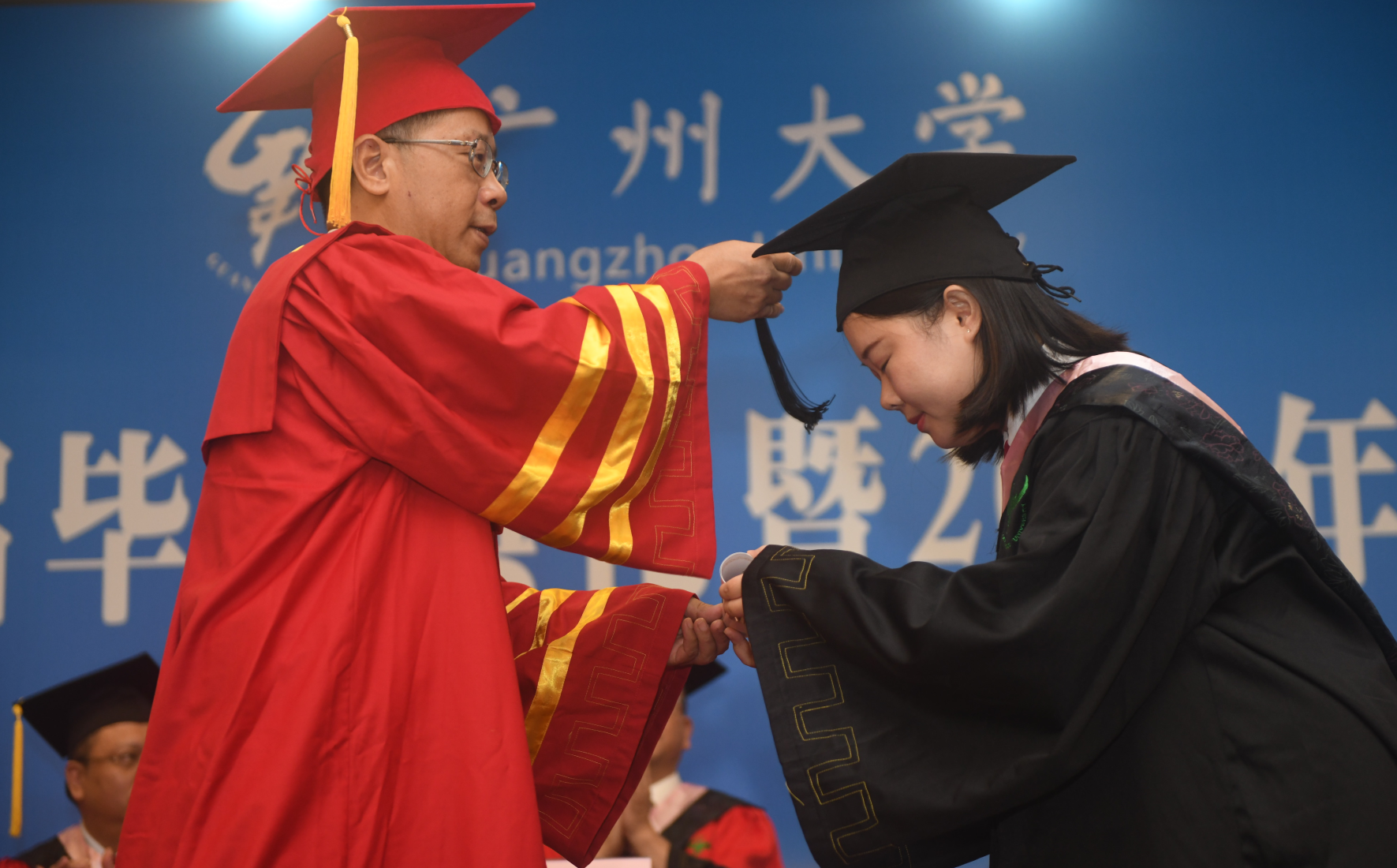 广州大学校长魏明海为毕业生拨穗。