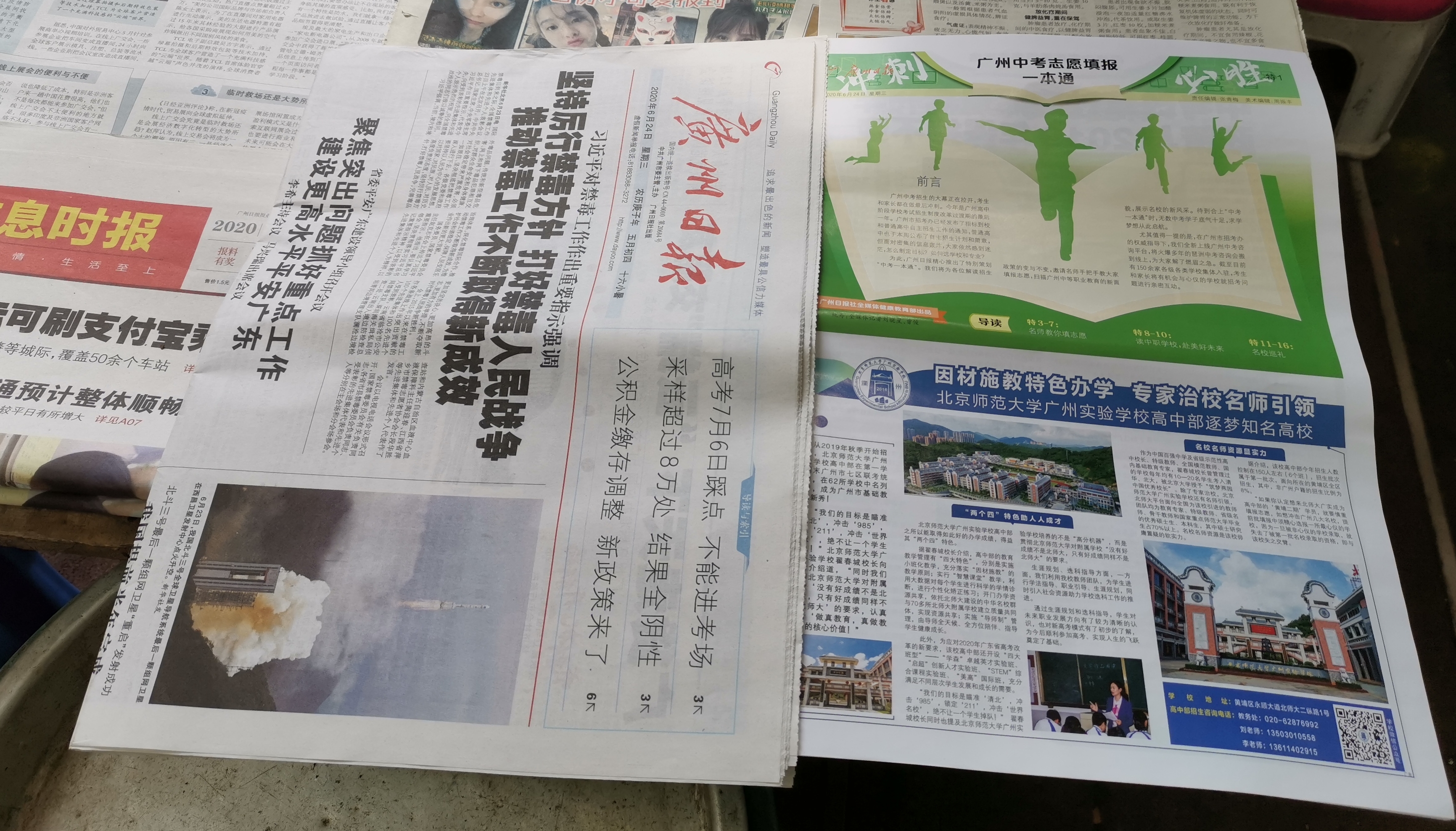 6月24日早上,广州多个报刊亭在迎来新一天《广州日报》的同时,也迎来了中考特刊《中考志愿填报一本通》。它和《广州日报》一起摆在报刊亭显眼的位置。就像《广州日报》一样,《中考志愿填报一本通》一经摆出,就受到追捧,不少报刊亭很快就卖出最后一册。