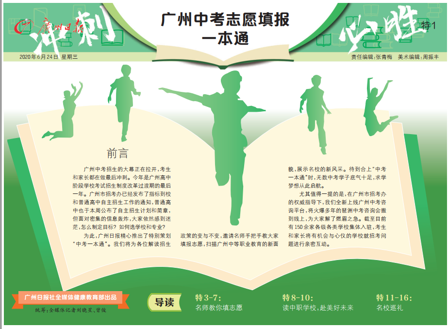 继“2020年广州市高中阶段学校招生线上咨询会”之后,今日广州日报再推出一款重磅产品——《中考志愿填报一本通》大型特刊。《中考志愿填报一本通》分为“名师教你填志愿”、“读中职学校,赴美好未来”、“名校巡礼”三大板块,综合多年大数据分析,请名师手把手教志愿填报,多维度展示名校风采,助力考生求学梦想。《中考志愿填报一本通》一经推出,就受到考生、家长和学校老师的欢迎和追捧。