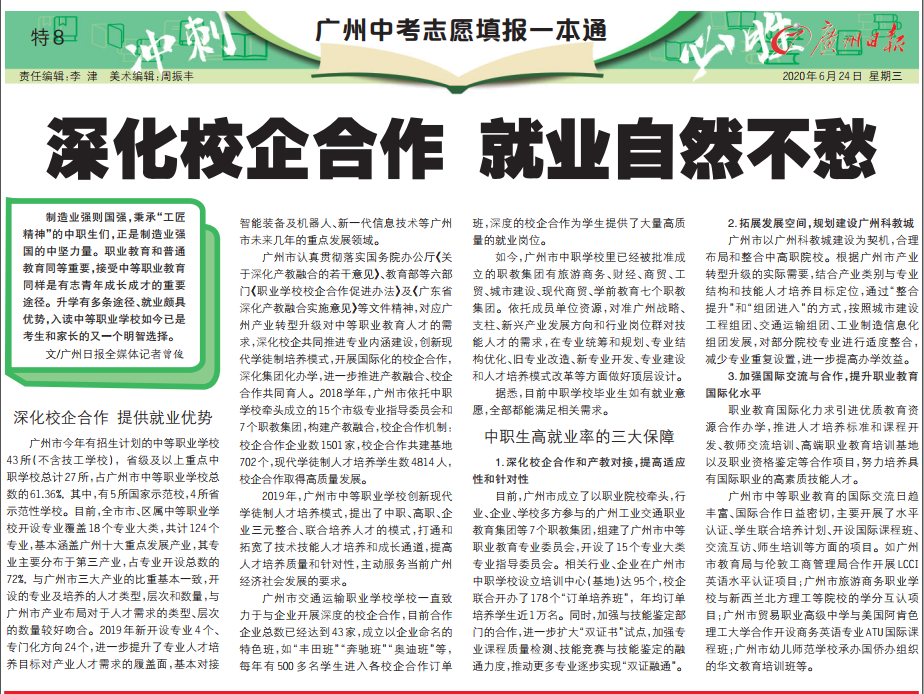 广州市财经职业学校负责招生工作的彭老师说,“中考一本通”特刊针对今年最新的中考招生政策进行罗列,从政策变化、志愿填报指导以及未来学生升学就业方向规划等关注热点都进行一一解答,面对不同层次的问题进行专业的详细解读,赋予了高中阶段学校在新形势下创新招生宣传模式的良好机遇,让学校能全方位精准展示普职名校独有的特色亮点,给予学生选择更加合适自身发展的道路创造了有利条件。