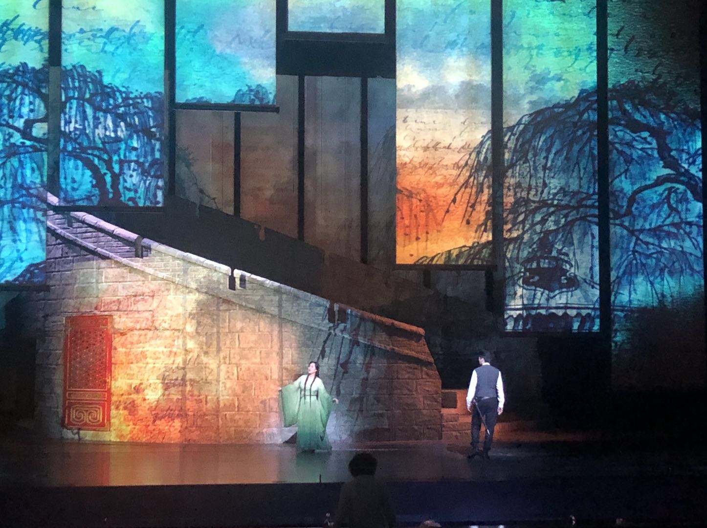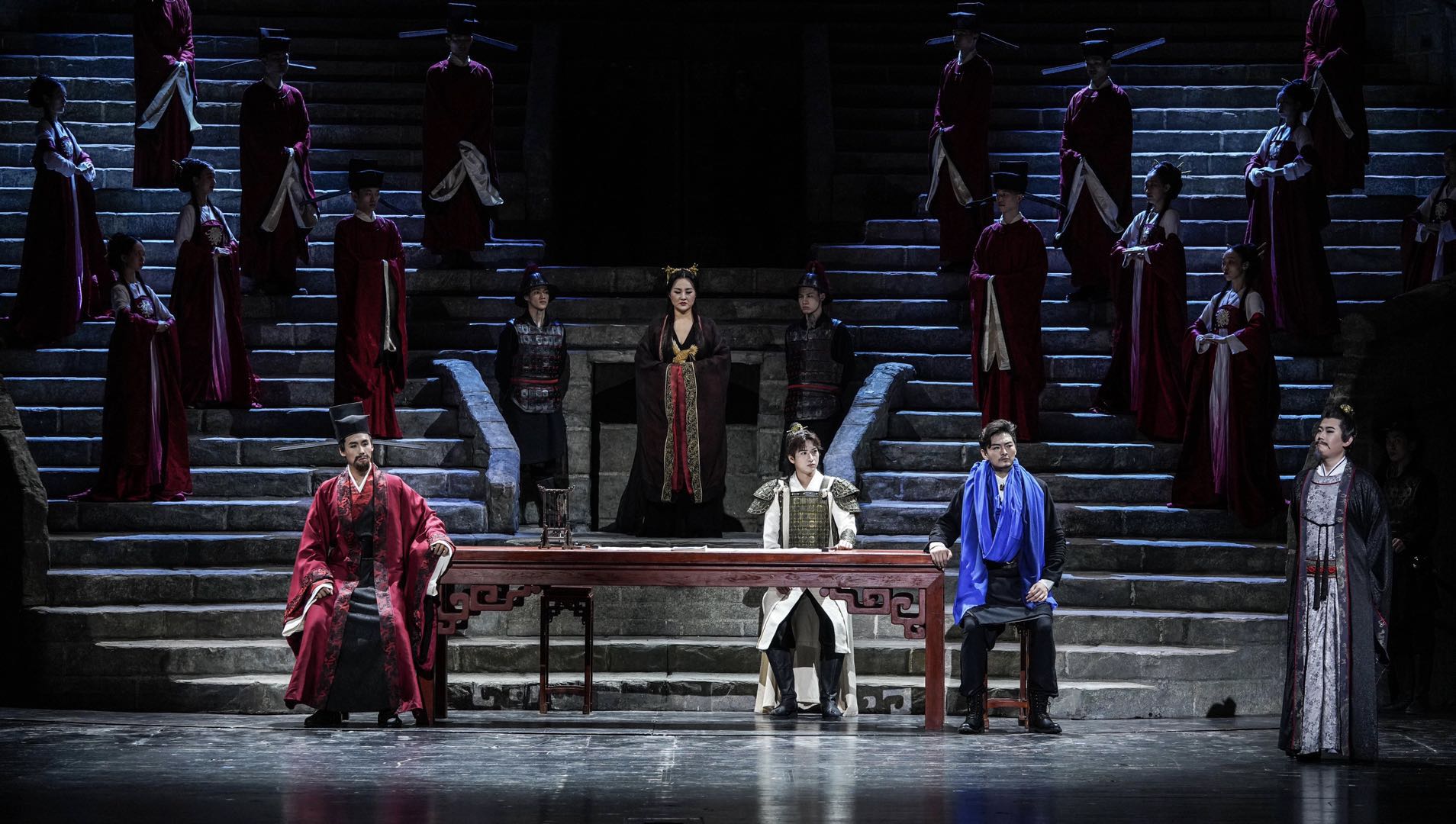 演出大幕开启。序幕中,监狱中的马可·波罗表达对中国的向往,一句唱词“鸟鸣叫在天上,云擦亮蓝天”立刻让人心情好明朗。事实上,王凯在剧中饰演的马可·波罗,戏份多到“几乎没有下过台”,他和女主角周晓琳的多首咏叹调也堪称华彩之作。