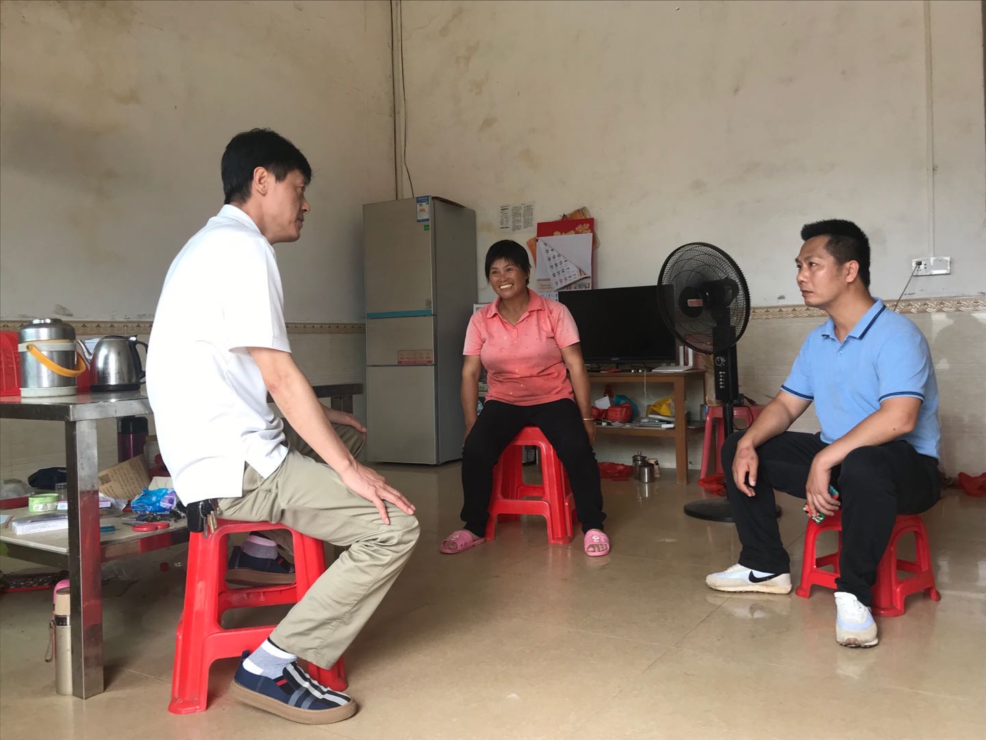 王文蔚(右一)到贫困户家里探访2018年的一天,王文蔚和帮扶干部入户走访时发现,勤丰村的贫困户杨宗光由于无特别工作技能且年过五十,一直处于失业状态,生活贫困艰苦,老婆因穷困弃家而走。
