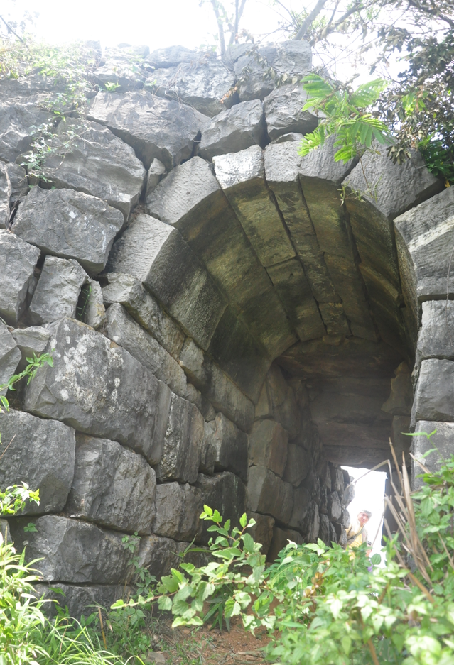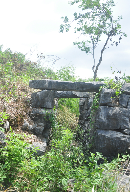 南面是古堡入口,地势低,耗材最多,正中是宽约米余的关塞,左右各是三米余高的石墙,相比东西两侧依山势构筑向内缩的石墙体,南侧石墙则近似直立,不容易攀爬,只要扼守关隘,则有“一夫当关,万夫莫开”之势。