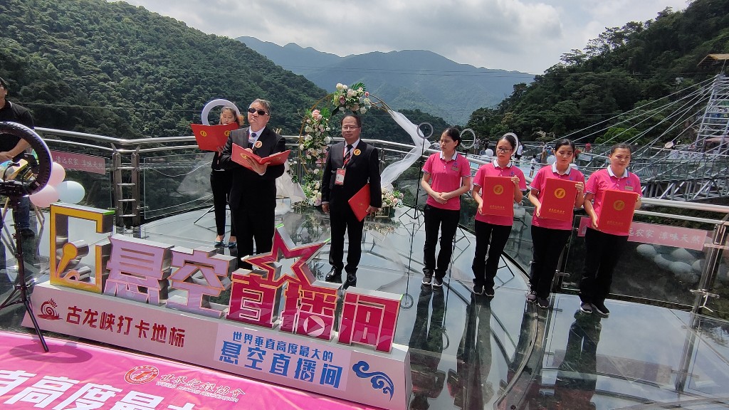 6月28日上午,2020“清远农家”古龙峡云端直播扶贫助农活动在清远古龙峡生态旅游区举行,同时宣布世界上垂直高度最大的悬空直播间、世界游览面积最大的高空玻璃组合、世界最多空中项目的景区三项世界认证成功,清远市委网信办将“网络主播创作中心”称号授予古龙峡景区。