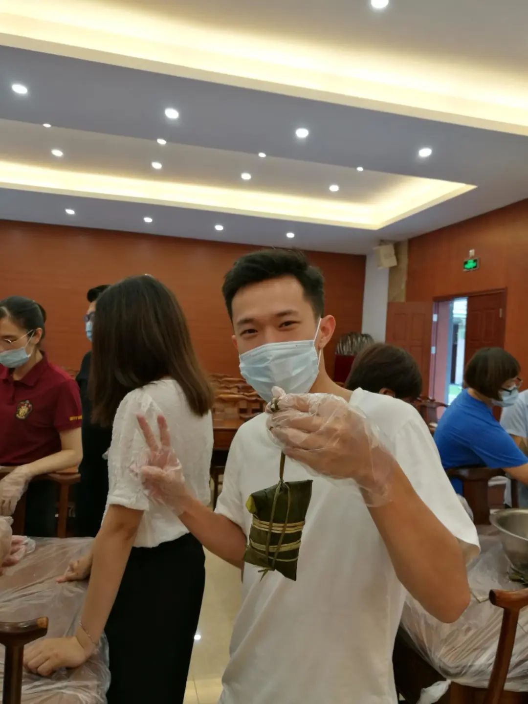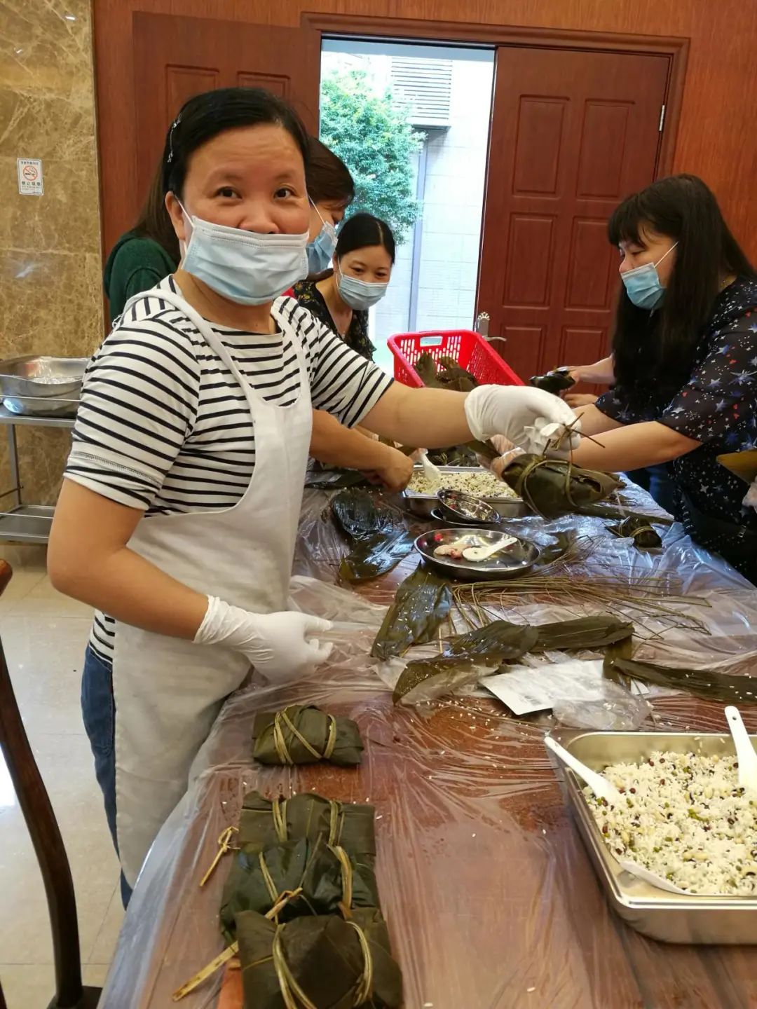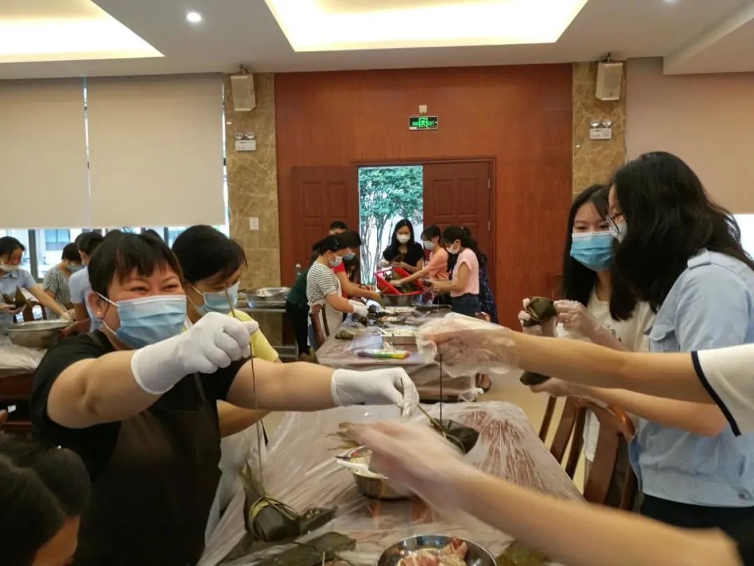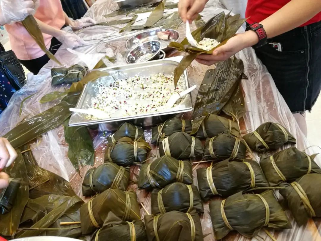 有着几十年包粽子经验的食堂阿姨一边包粽子,一边传授经验,自觉当起了“师傅”。年轻会员们情绪高涨,你拿粽叶我添米,大家相互合作。拿粽叶、填糯米、压紧实、封口、扎捆,巧手翻飞,不一会儿功夫,一只只五香咸肉粽瞬间成型。
