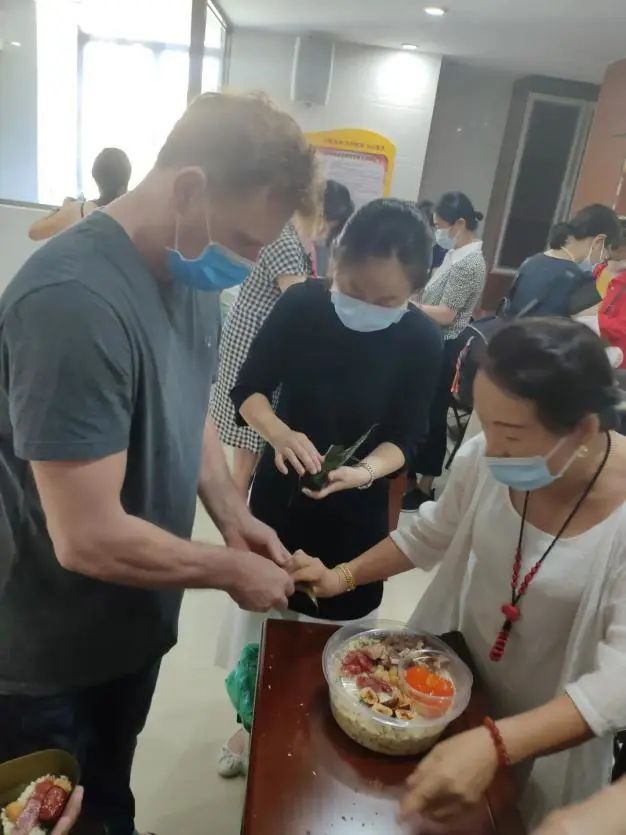 “三人行,必有我师焉”,现场有许多的包粽子的高手,2-3分钟就可以包好一只精巧的粽子。来自澳大利亚的这位外国友人也在一众“师傅”的指导下动起手来,势要包出一只合格的粽子带回家。