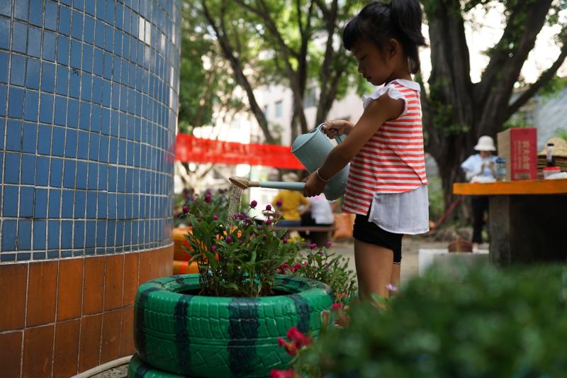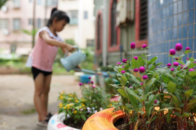 小朋友为轮胎花园的花草浇水据夏良村社区综合服务中心社工黄成敏表示,“初心田园”地块属于夏良中心公园内,由于长期缺少维护,公园的绿化设施及活动场地未能发挥其最大的作用。