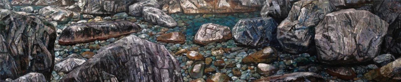 此次展出的长达8米的大幅油画《顽石图》是邵增虎在83岁高龄完成的力作,在他画刀的深厚功力下,画面中的顽石仿佛经过千百年锤炼,最后裂痕重重,形成了各种各样、深浅不一的巨大裂痕。“在这张作品里,我特别强调被大自然腐蚀的感觉,它给你一种时间感、历史感,给你一种生活的磨难的感觉,但是它们仍然屹立不动,透露着坚强和坚定。”