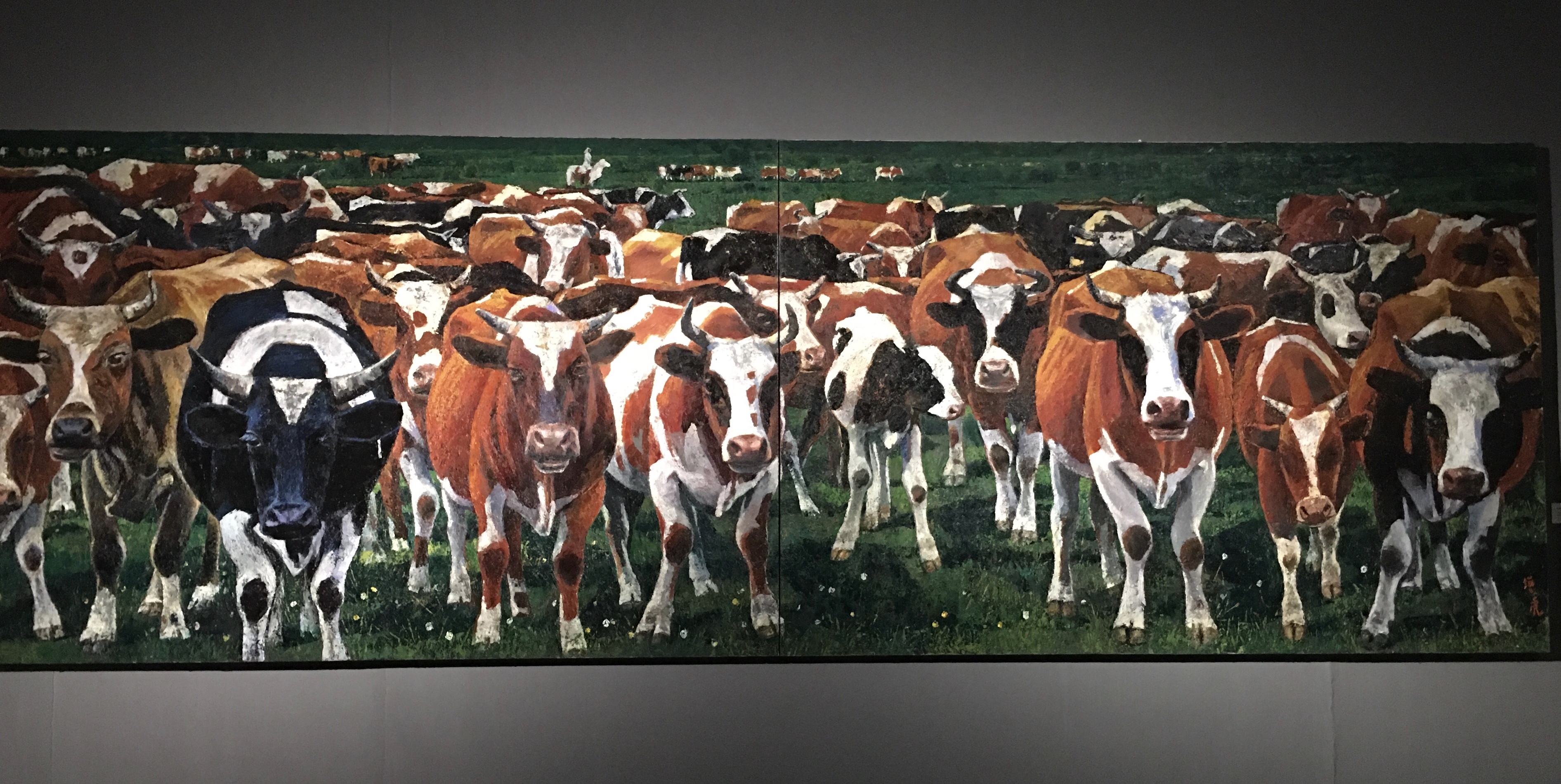 “牛”这一形象也经常出现在邵增虎的画中,他亲切地称它为“老朋友”,为什么喜欢画牛?他说,“因为我最熟悉的也就是牛。我小的时候就放牛,一直放到我小学毕业,进了初中我就离开家乡,没有再放牛了。从小到上中学之前这段时间一直放牛,跟牛建立了感情。”他笔下的牛也因此带着拟人化的生动——阳刚、憨直,有一股脚踏大地却总在仰望星空的倔强。