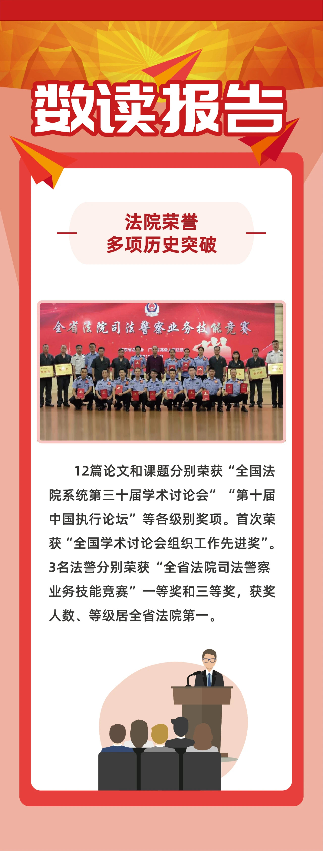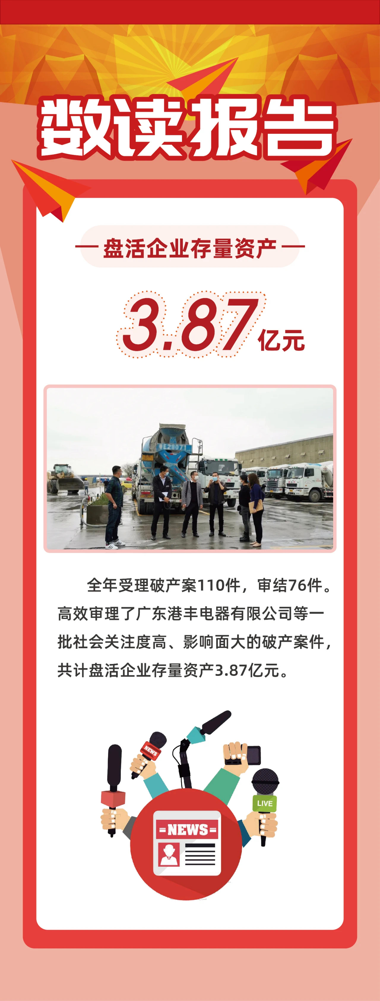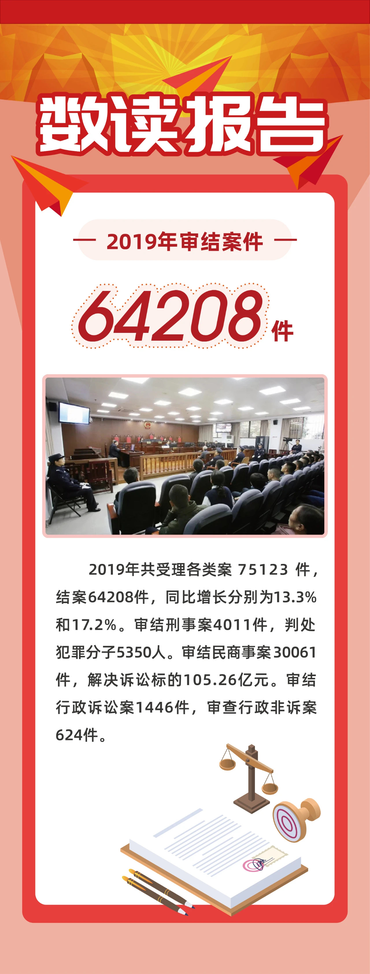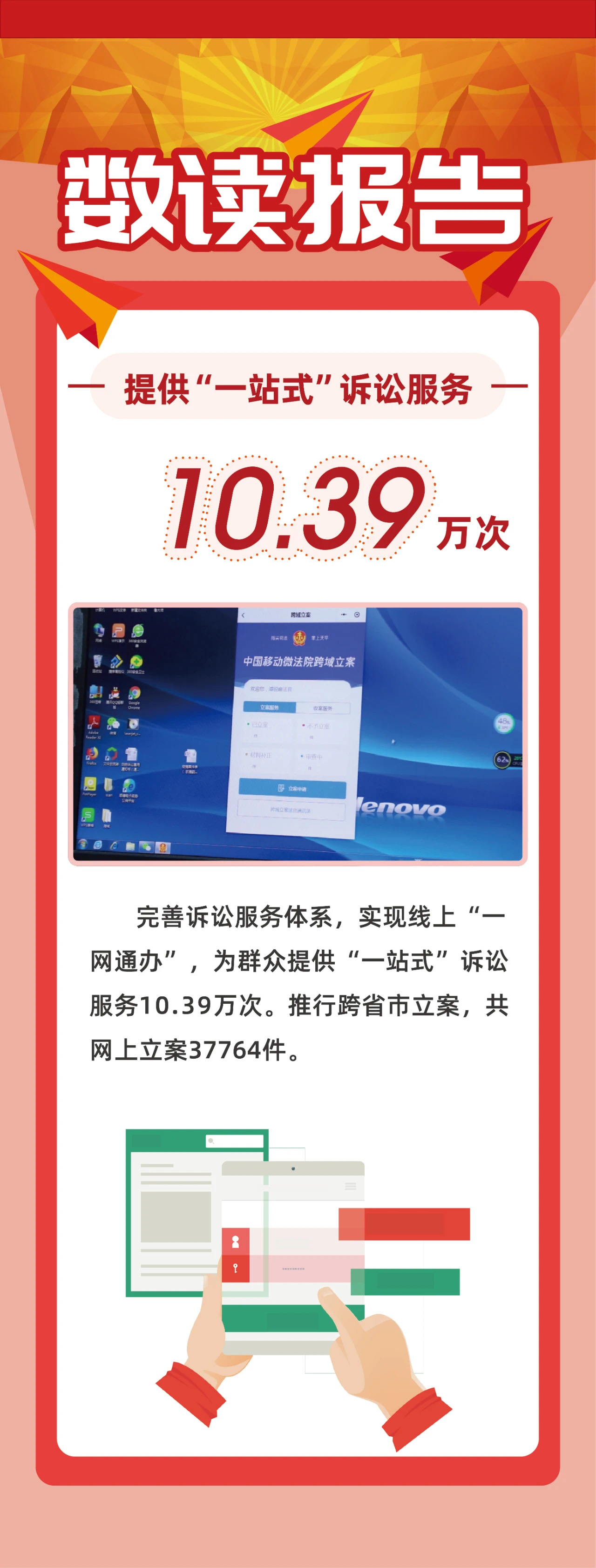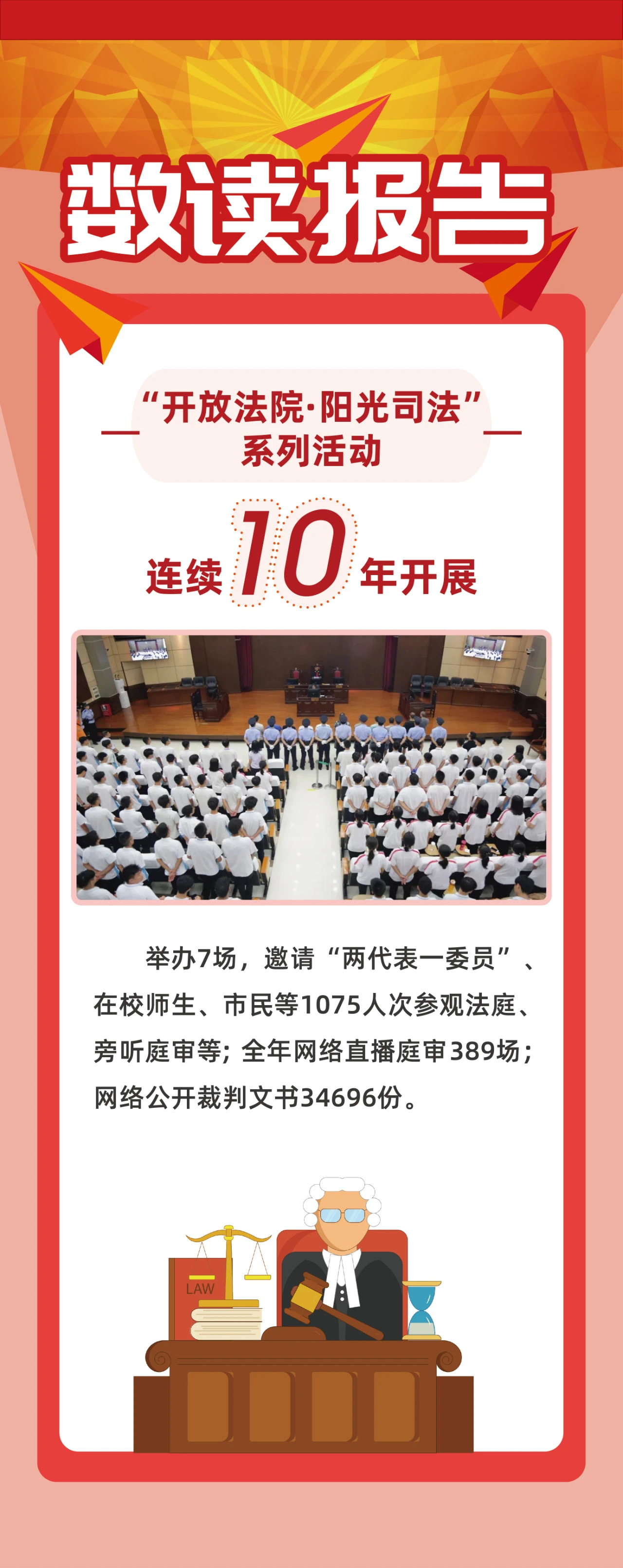 阳光司法:全年网络直播庭审 389场,网络公开裁判文书34696份。
