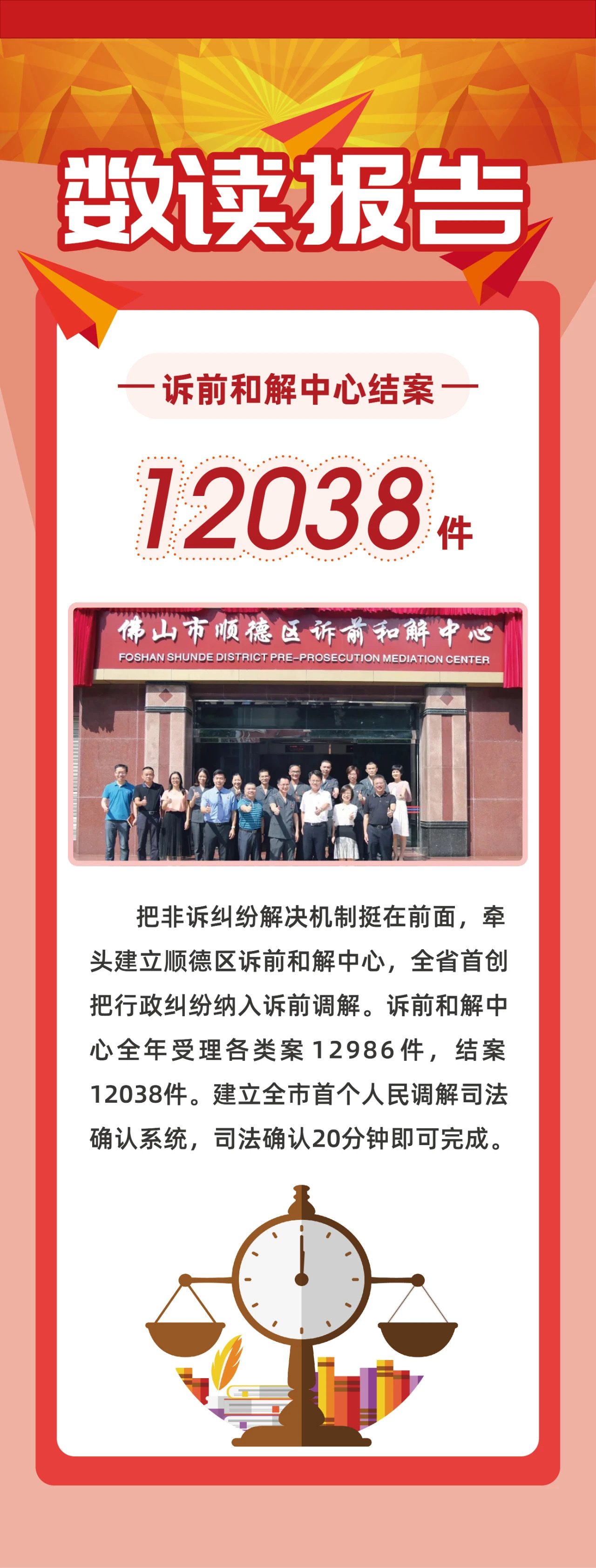 诉源治理:将“两个一站式”建设作为全年中心工作,全年诉前和解中心受理各类案12986件,结案12038件,大量纠纷在诉前得到化解。