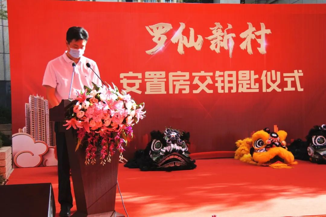 仪式上,花城街道办事处主任黎汝坚发表致辞。他代表花城街党工委、办事处向即将乔迁新居的各位乡亲表示热烈祝贺,感谢广大乡亲们的理解、信任和支持,感谢大家克服自身困难,全力支持拆迁工作。