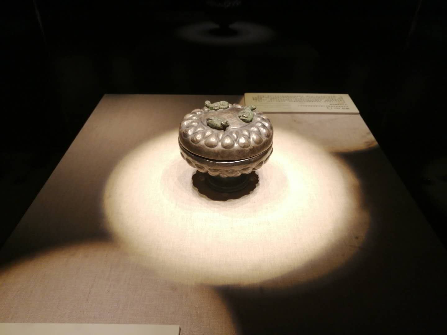 展览中一件裂瓣纹银豆出自大武汉墓,通高10.9、口径11.3、盖径12、足径6厘米,与西汉南越王博物馆出土的银盒造型极为相似。裂瓣纹又称蒜头纹,这种纹饰由锤鍱的方法制成,曾流行于古波斯安息帝国(公元前247~前224年)的银器上。这类裂瓣纹银盒或银豆,通常与海外文化有关。从造型和材质等方面考察,这两件银器很可能是“一批货”,从海外输入中国之后被分销到不同的地区,且都成了王家珍藏。至于豆与盒的不同造型,大约是因为在不同的使用者手中,根据需要进行了本地化加工。