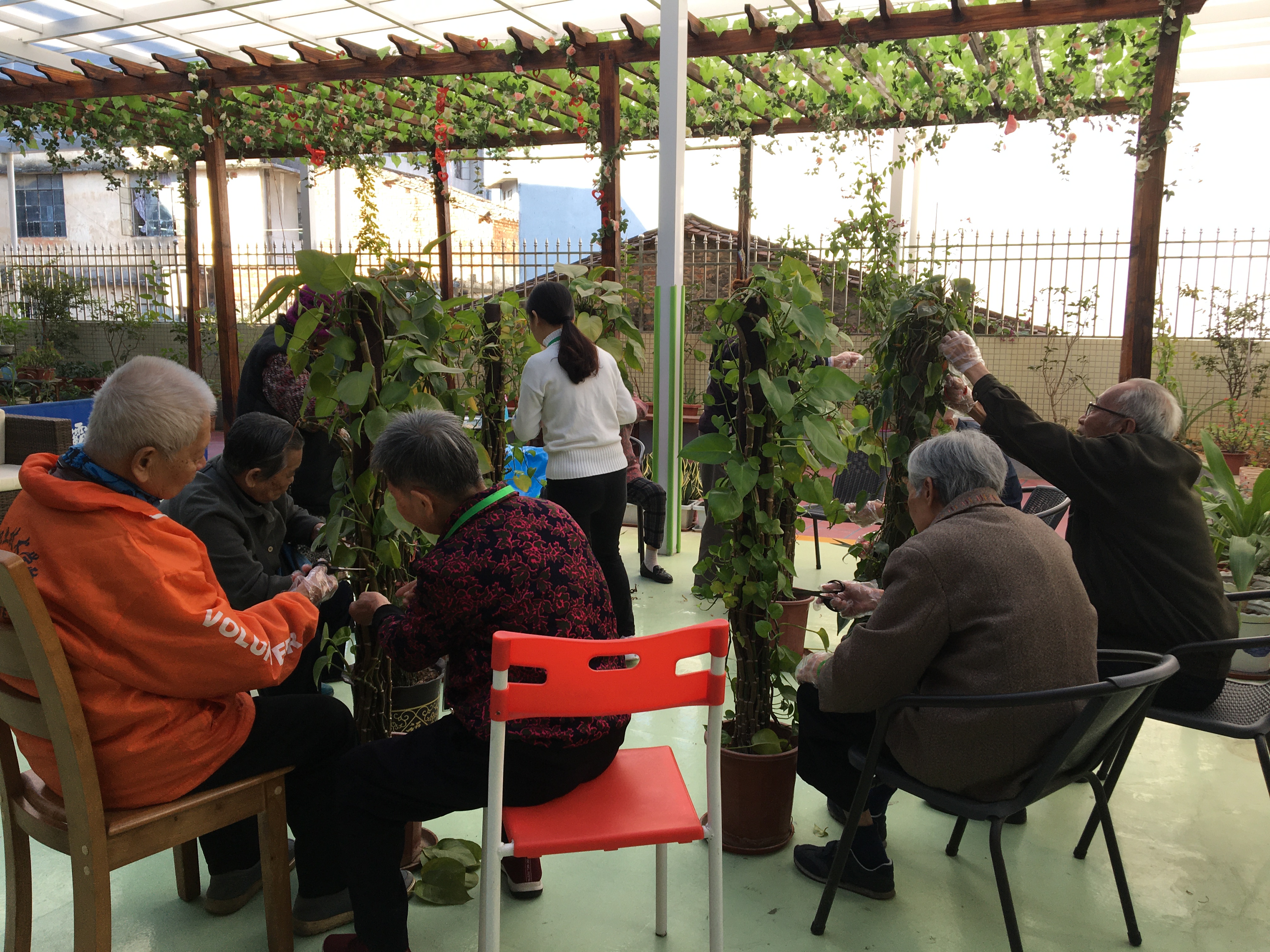 在这里配置了跨专业的服务团队,由社工主导,护理员照护、护士、康复师跟踪,为每一位长者定制个人照料计划,提供日间个人照料、健康监测、康复指导、助餐配餐、文娱康乐活动等。社工定期开展相关康乐和认知训练活动,康复师会为长者做一些个人康复训练。社区居家养老服务中心获得社会热心企业捐赠,获得10万元资金建设园艺阁。长者园艺治疗服务邀请农林专业老师开设园艺活动,参与对象主要是初步评估为疑似认知障碍症、高龄独居等长者,通过园艺相关活动,接触植物的触角、听觉、味觉、嗅觉或视觉等感官刺激,提高长者专注力,增加长者社交网络,加强机体训练,改善身心健康,促进长者社会功能的改善和提升。