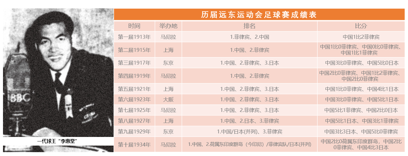 中国男足当时取得的远东运动会足球“四连冠”,正是二代球王梁玉堂领衔的时代。此后,李惠堂横空出世,从此带领中国足球在远东运动会上“乘风破浪”。