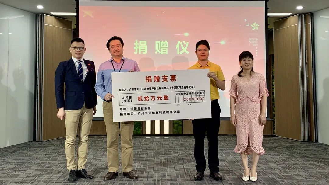 活動中,廣州專創信息科技有限公司還向天河區港澳青年之家捐贈20萬元,支持港澳青年青創服務,共同打造溫暖的創業之家,為港澳青年創新創業發揮新動能。