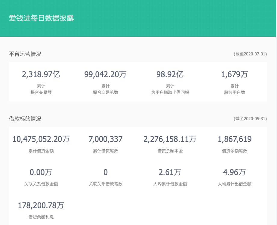 爱钱进官网显示,截至5月31日,爱钱进借贷余额227.6亿元,借贷余额笔数为186.76万笔,人均累计出借金额4.96万。