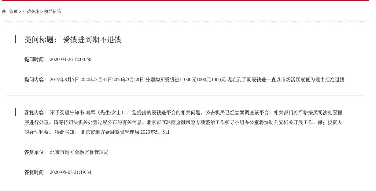 实际上,爱钱进平台逾期事件在今年初已有发酵,并不断有投资者在网上投诉。而在今年5月8日,针对有投资者提出爱钱进到期不退钱的问题,北京市地方金融监督管理局在其官网答复表示,公安机关已经立案调查该平台,相关部门将严格按照司法处置程序进行处理。不过,目前,警方并未公布立案详情。
