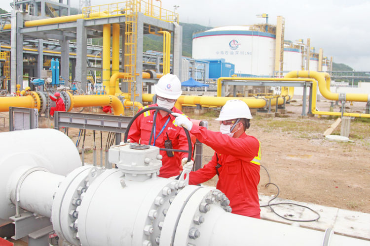 中海油深圳LNG操作员在打开阀门通入天然气。