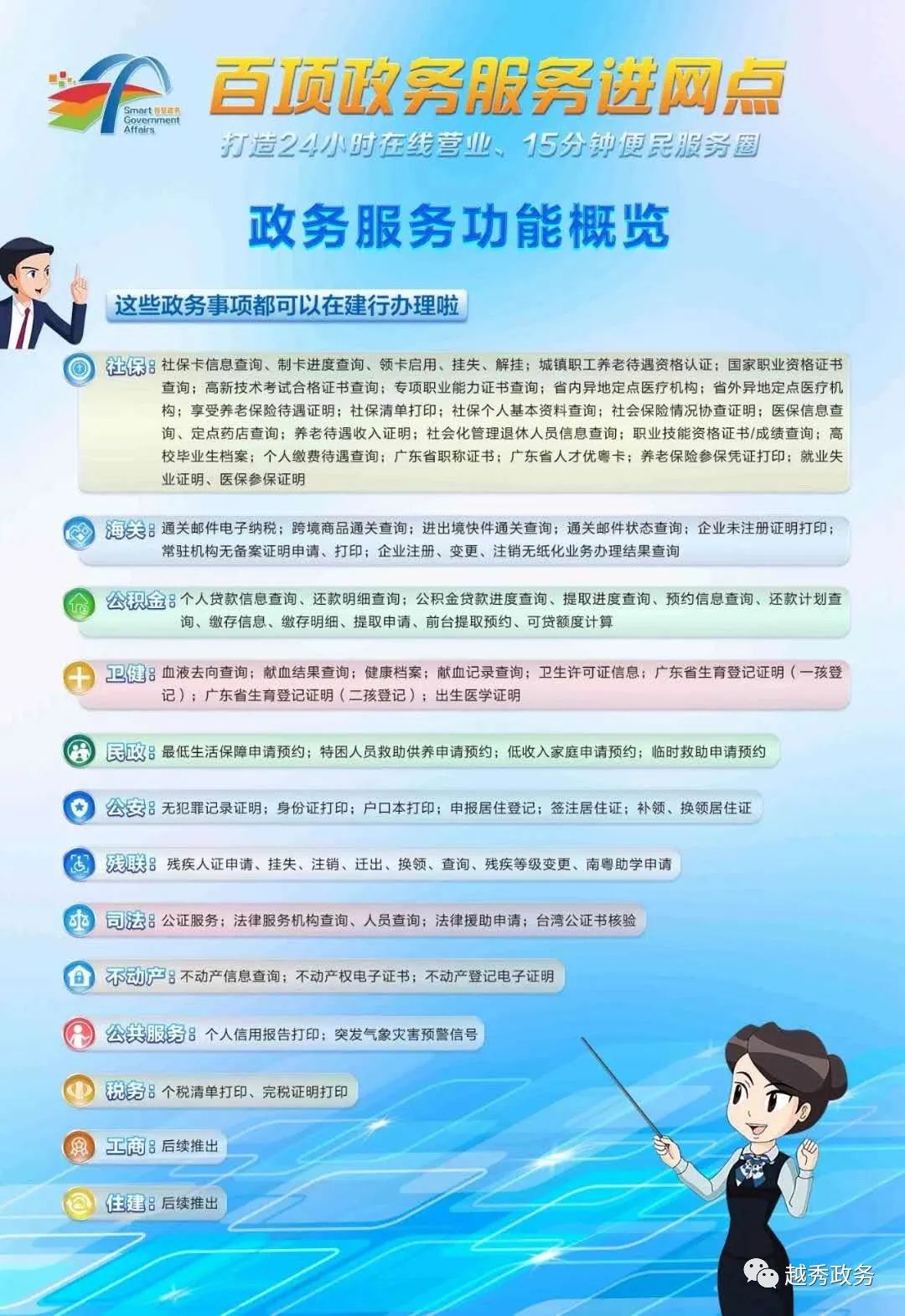 建行广州越秀支行全力在智能服务区打造“政务服务区”,并将在越秀区辖内的35家网点智慧柜员机全面上线政务服务功能,涵盖了社保、公积金、工商、税务、公安、残联、司法、不动产、住建、海关、民政、卫健、公共服务等13个大类共113项,包括了身份证及户口本复印件、出生医学证明、个税完税证明、个人信用报告等高频政务事项,还可提供不动产登记电子证明、不动产权电子证书等实用查询功能。