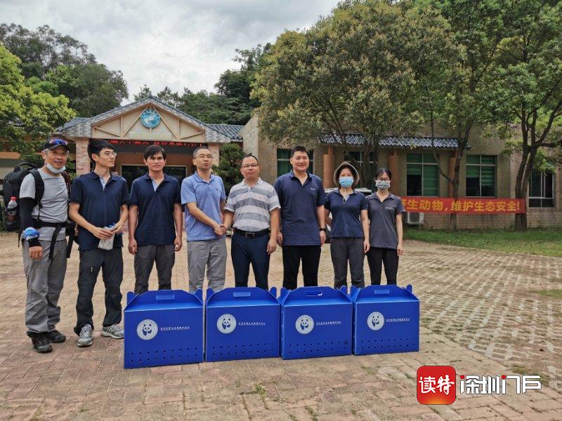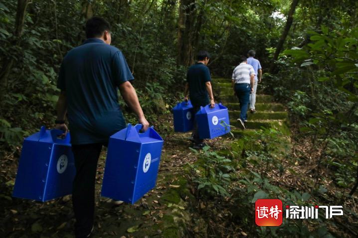 7月3日,驱车100多公里抵达惠州,记者随野保人员冒着倾盆大雨,沿着长满青苔的罗浮山科研人员登山专用道,爬至半山腰。在一处较为开阔的树林间,野保人员放下蓝紫色的中国野生动物救护专用塑料盒,打开了敞口,开始放归。