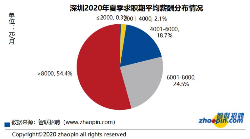 深圳地区2020年夏季求职期的平均薪酬为10565元/月,在全国38个主要城市的薪酬水平中排名第三位,其中8000元以上/月的职位在职位总量中占比达54.4%,而平均月薪最高的是信托/担保/拍卖/典当行业的平均月薪最高,为14614元/月。