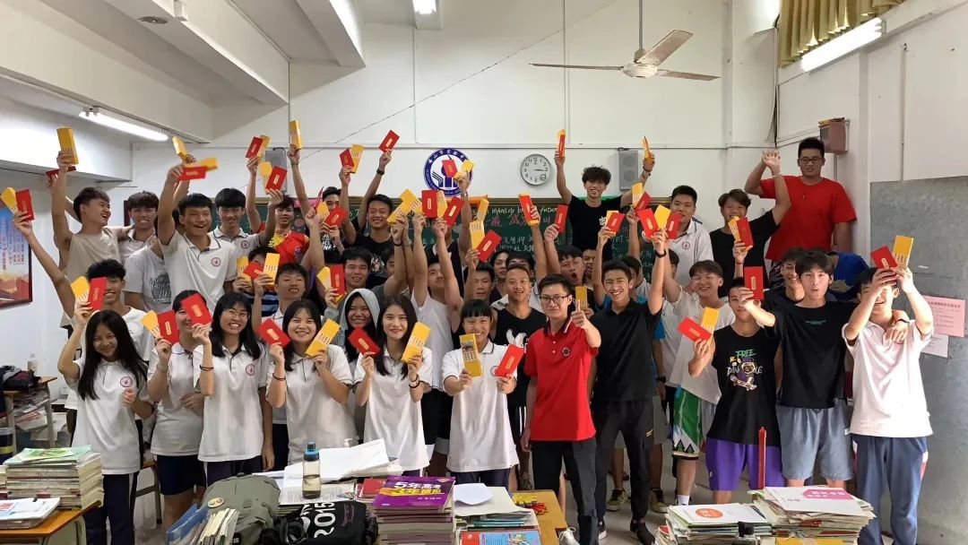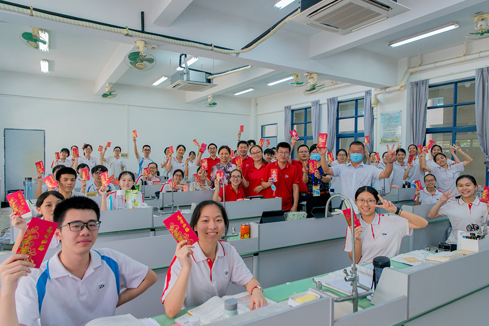 同时,佛山市实验中学同学们还收到了各种各样的打气小礼物,比如寓意大吉大利的红包,在送考红包的背面,老师亲手写上满满的祝福:“愿你合上笔盖的那一刻,有战士收刀入鞘的骄傲。”老师还为学生戴上“逢考必胜,金榜题名”的手环,寄托美好祝愿。