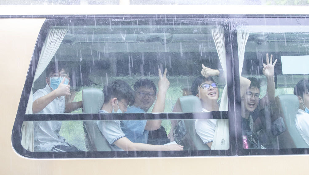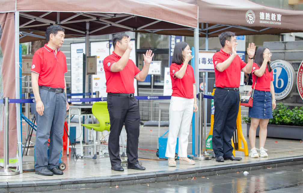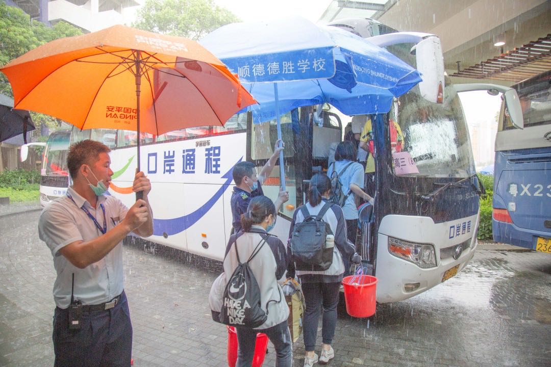 今年,德胜学校高中部考生将在郑裕彤中学考点考试,在提前入驻考点前,恰逢大雨,德胜学校高中部老师、校务人员还身着红衣,驻足风雨中,为考生加油鼓劲。