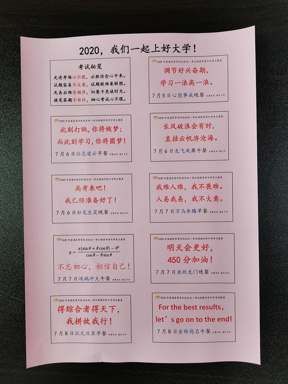在顺德华侨中学,餐票中同样藏有“小玄机”:“心想事成”晚餐、“壮志凌云”早餐……记者了解到,从5日到8日,每一张饭票上都有一句鼓励的话语,如“我难人难,我不畏难,人易我易,我不大意。”等。另外,学校还根据不同学科特点,将鼓励的“密码”暗藏数学公式、英文短语中,十分有趣。