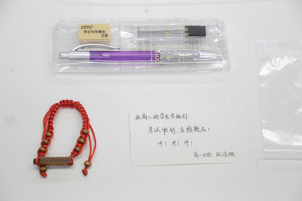 在德胜学校高中部,高三学生也收到了来自老师送出的幸运手绳。该校高三一班级的班主任还给每个学生手写祝福并折成纸飞机,寓意同学们飞得更高更远。
