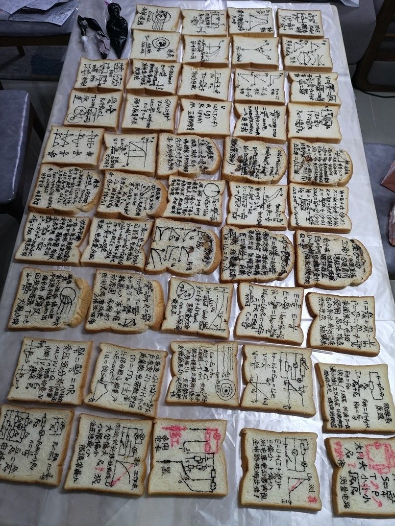 陈老师告诉记者,作为一名高三班主任,自己很早就开始筹划要给学生们一个具有纪念意义的礼物,在高考前给学生们打气加油,而最好的礼物莫过于是自己手工制作的、一些具有象征意义的东西——左思右想,忽然,陈老师想到“哆啦A梦”里面的一幕,“机器猫给了大雄一片面包,可以复印书上的知识,吃掉一片就学会这一页的知识啦!高考前把知识都吃到肚子里、印到脑袋里,这不正是学生们一直想要的吗?!”