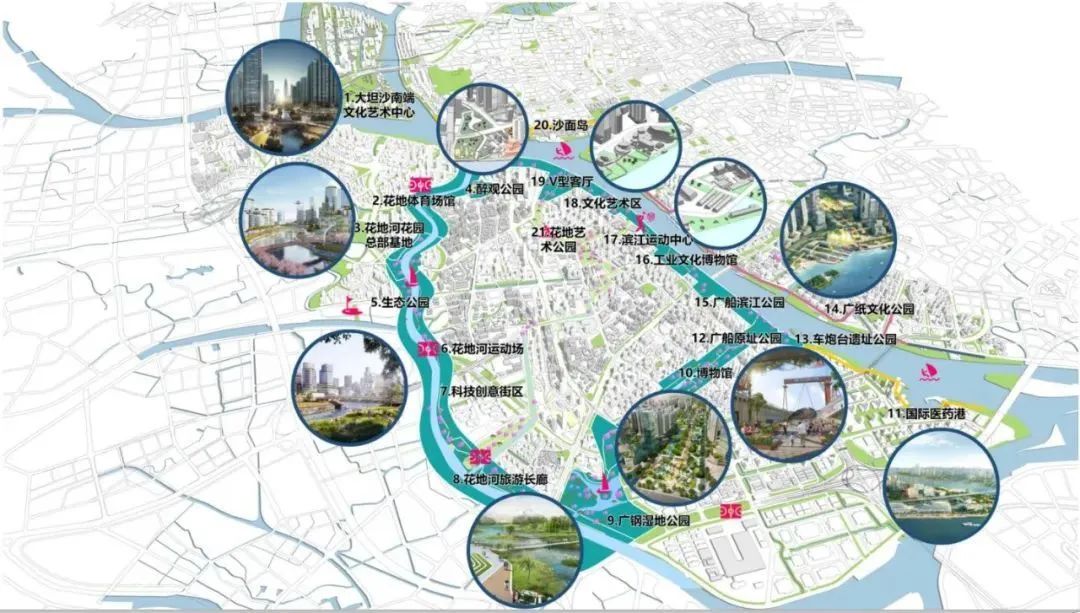 绿地系统规划也非常有特色的,提出打造15公里长的白鹅潭翡翠项链(碧道),有机串联开敞空间,保留历史印记,进行后工业景观生态修复,打造集户外休闲娱乐、工业文化遗产于一体的复合型公园体系。包括了大坦沙南端文化艺术中心、V型客厅、沙面岛、花地艺术公园、广船滨江公园、广纸文化公园、广船原址公园、广钢湿地公园等20个节点。