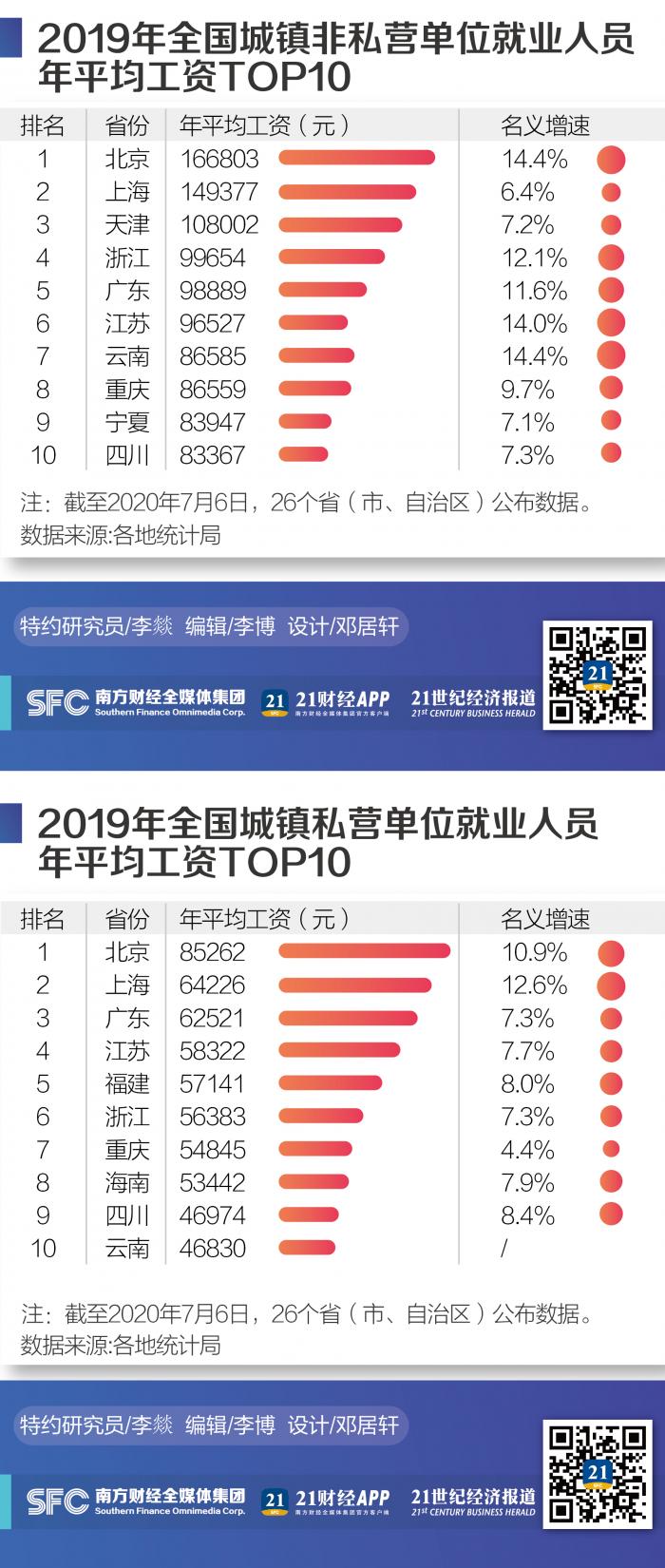 其中,在城镇非私营单位中,北京、上海、天津年均工资最高,2019年均在10万元以上;在城镇私营单位中,居前三的则是北京、上海、广东,2019年年均工资均在6.2万元以上。