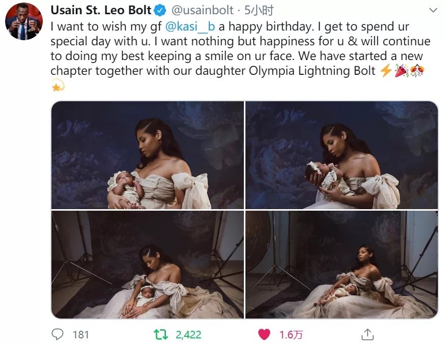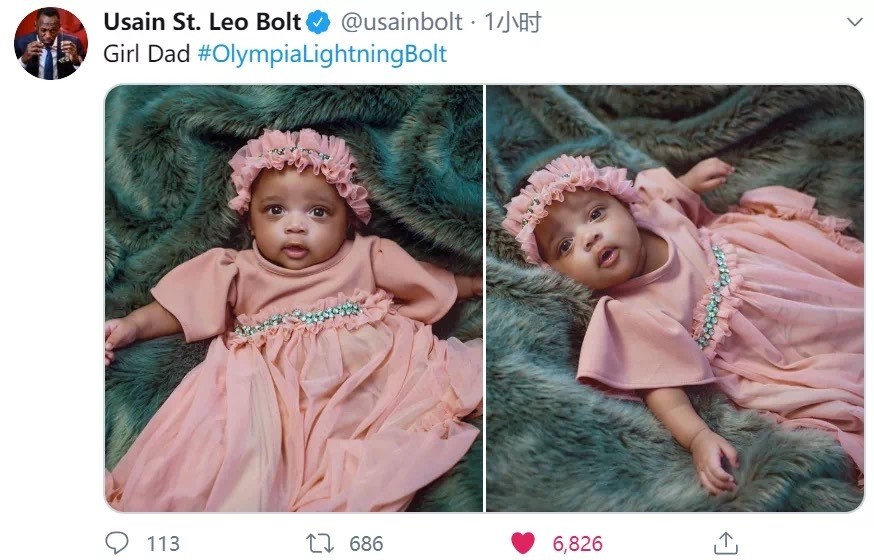 如今,他们迎来第一个孩子——女宝。名字肯定是博尔特取的——Olympia Lightning Bolt(奥林匹亚·闪电·博尔特),这就是个性非凡的博尔特,他的职业生涯像闪电一样席卷8枚奥运金牌,他希望女儿像他一样。