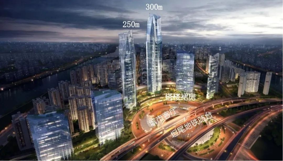 核心区将围绕坦尾地铁站,打造西部新地标,其中富有代表性的“双子塔”大楼高度将从原规划的150米提高到300米。同时考虑到滨江一线形成前低后高的景观界面,对部分滨江地块建筑高度进行优化,由现行控规限高100米调整为滨江一线60~100以内,二线控制在140米以内。